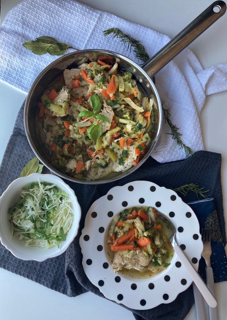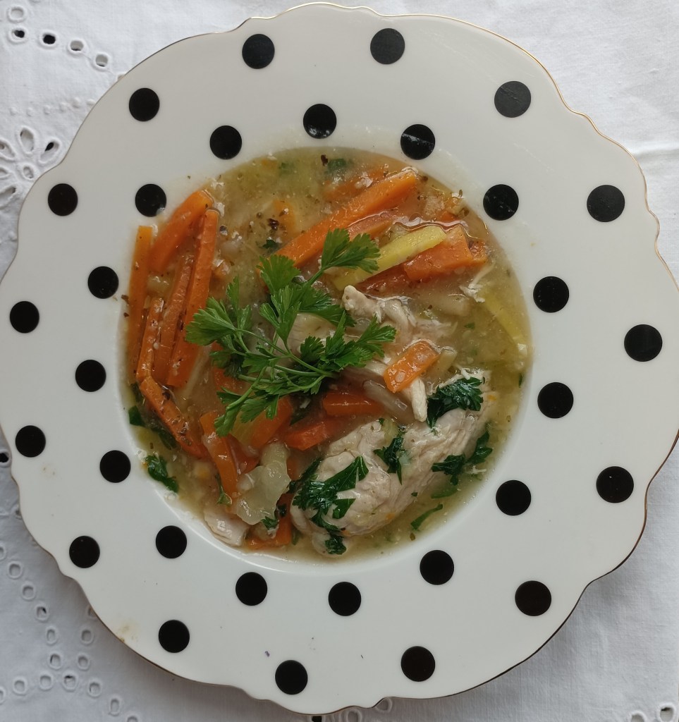 - razno povrće: dvije mrkve, peršin, komad celera, tikvica, paprika, grašak, mahune, krumpir (što se ima na raspolaganju i/ili prema želji)