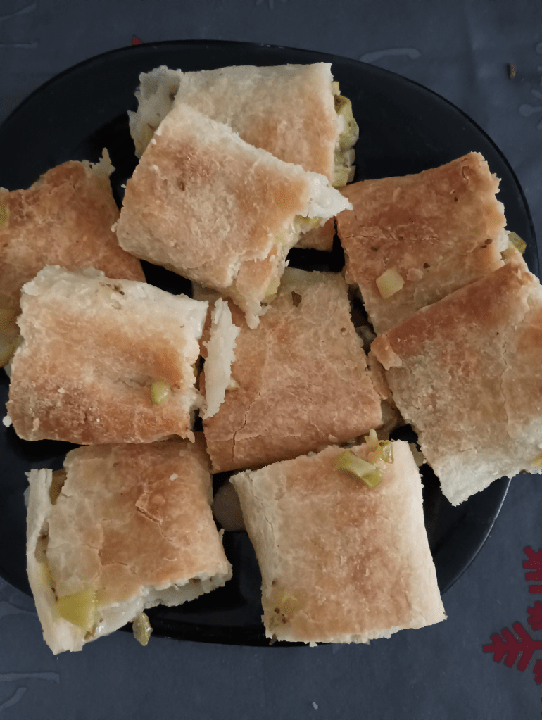 Tijesto: brašno, količina po želji, odvoji se u posudu. U brašno se doda ulje, malo praška za pecivo i prstohvat soli. Polako se dodaje mlaka voda i mijesi tijesto koje ne smije biti ljepljivo. Podijeli se na manje kugle, koliko je moguće, koje se potom tanko razvuku.