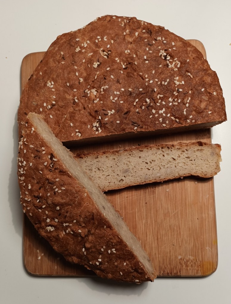 Peći 90 minuta u pećnici na 200 stupnjeva s posudom s vodom (detaljni postupak u receptu: Kruh s tri brašna).