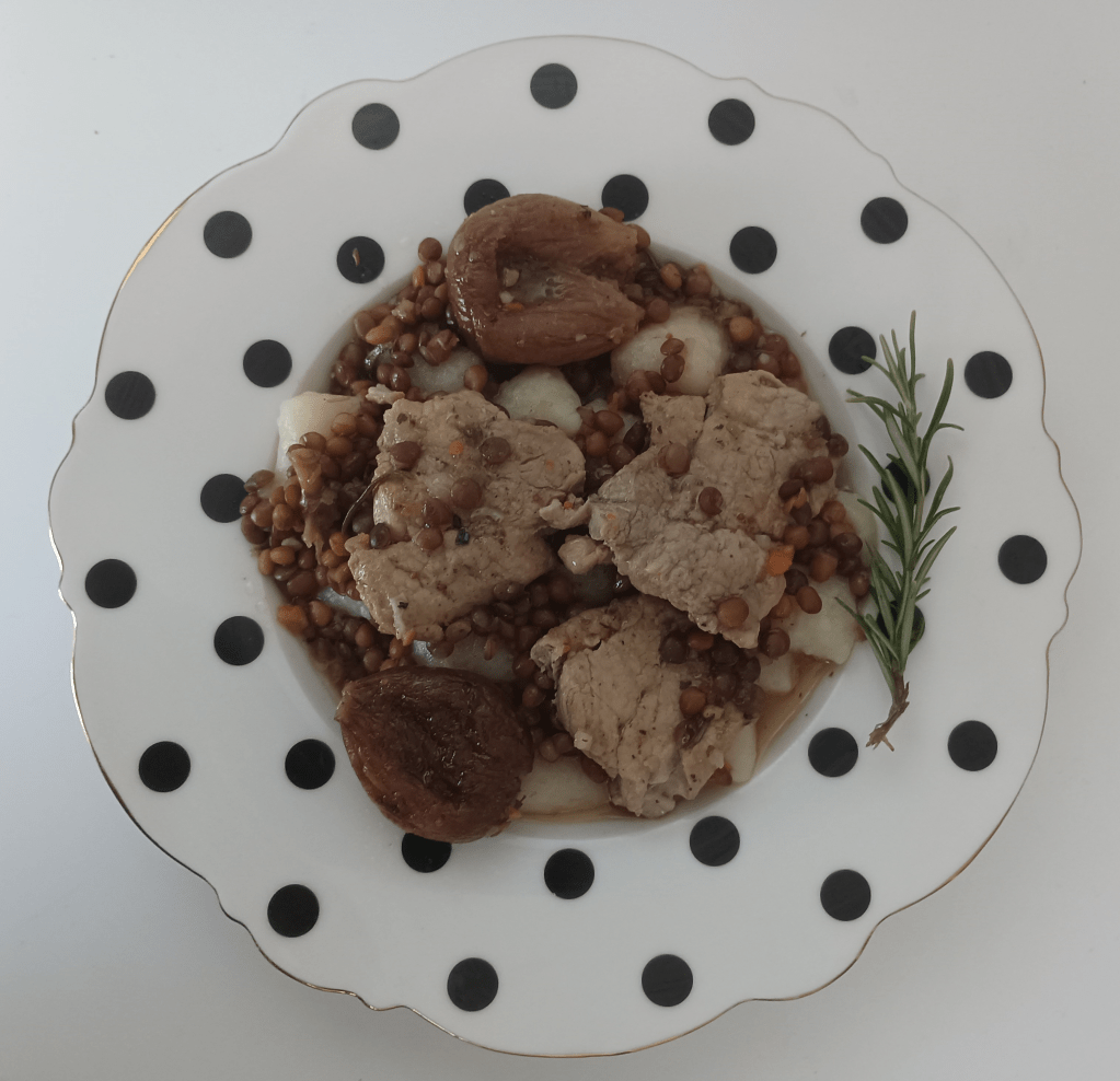 Lungić očistiti od kožica, isjeći na kolutiće i izlupati batom za meso (preko prozirne folije). Kolutiće lungića staviti na tavu u kojoj se prethodno dinstao crveni luk. Dinstati meso uz dodavanje vode. Posoliti, začiniti dodati suhe smokve i dinstati 30-ak minuta. Dodati leću iz konzerve i ostaviti još pet minuta da se okusi spoje. Preliti preko njoka (kao na slici) ili preko tjestenine.