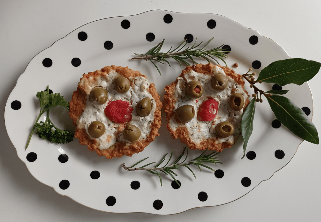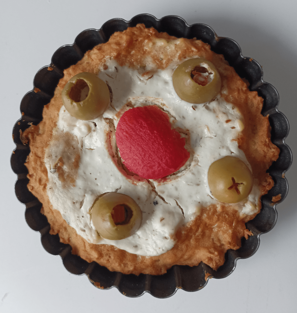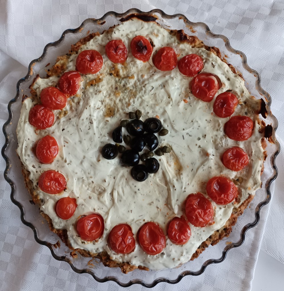 Sirovu kvinoju kuhati (u omjeru 1:3 s malo posoljenom vodom) dvadeset minuta ili dok se sva voda ne upije. Pustiti da se ohladi. Kuhanoj kvinoji se dodaju jaja, ulje, sol, prašak za pecivo i polako se dodaje brašno. Tijesto je još mekano. Žlicom se stavlja u kalup za prhko tijesto, okruglu tavu s papirom za pečenje ili, kao u ovom slučaju, male kalupe za tart. Peče se u zagrijanoj pećnici na 180 stupnjeva 15 minuta. Izvadi se iz pećnice i stavi punjenje. Pomiješa se grčki jogurt, usitnjeni feta sir (oprezno posoliti jer je feta sir slan), dodati začine i premazati tijesto tarta. Poslagati prepolovljene masline i male rajčice sve po želji). Ponovo se stavi na pečenje još desetak minuta. Može se prije pečenja ili prije konzumacije naribati tvrdog sira.