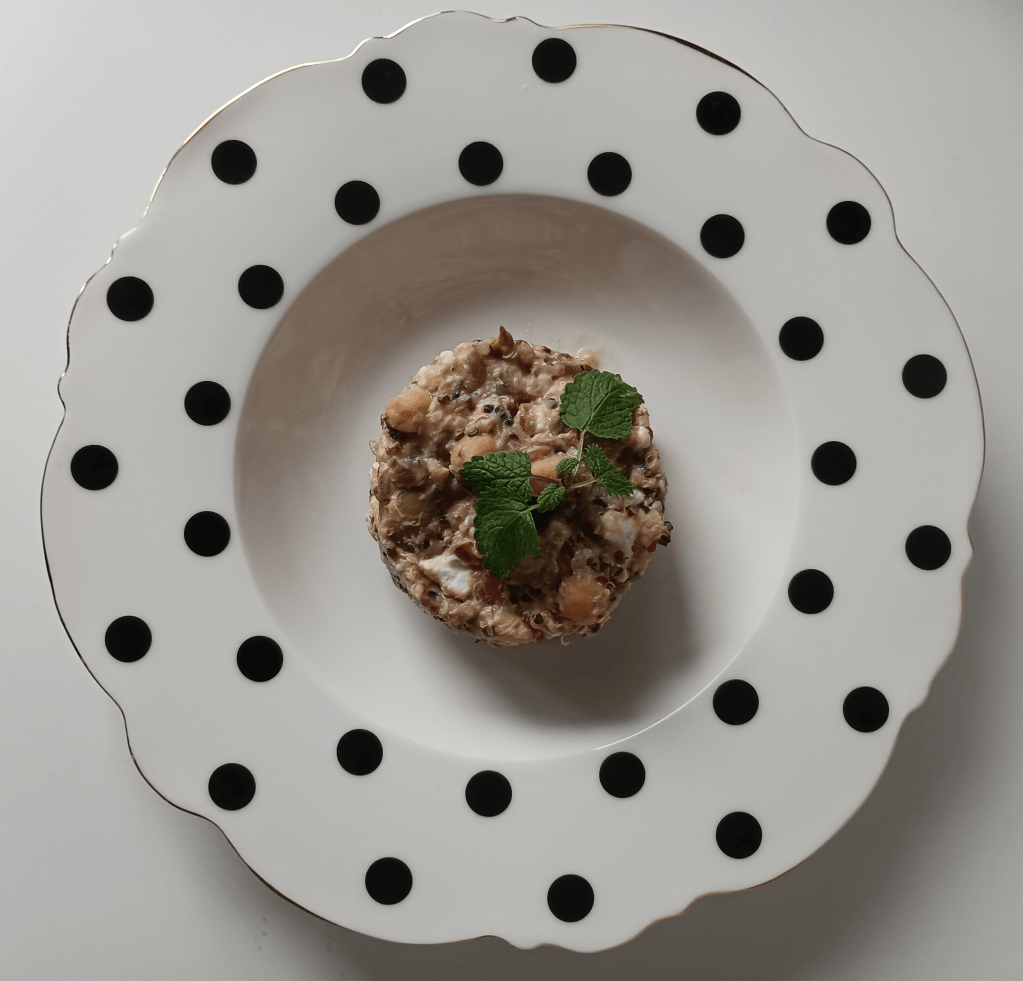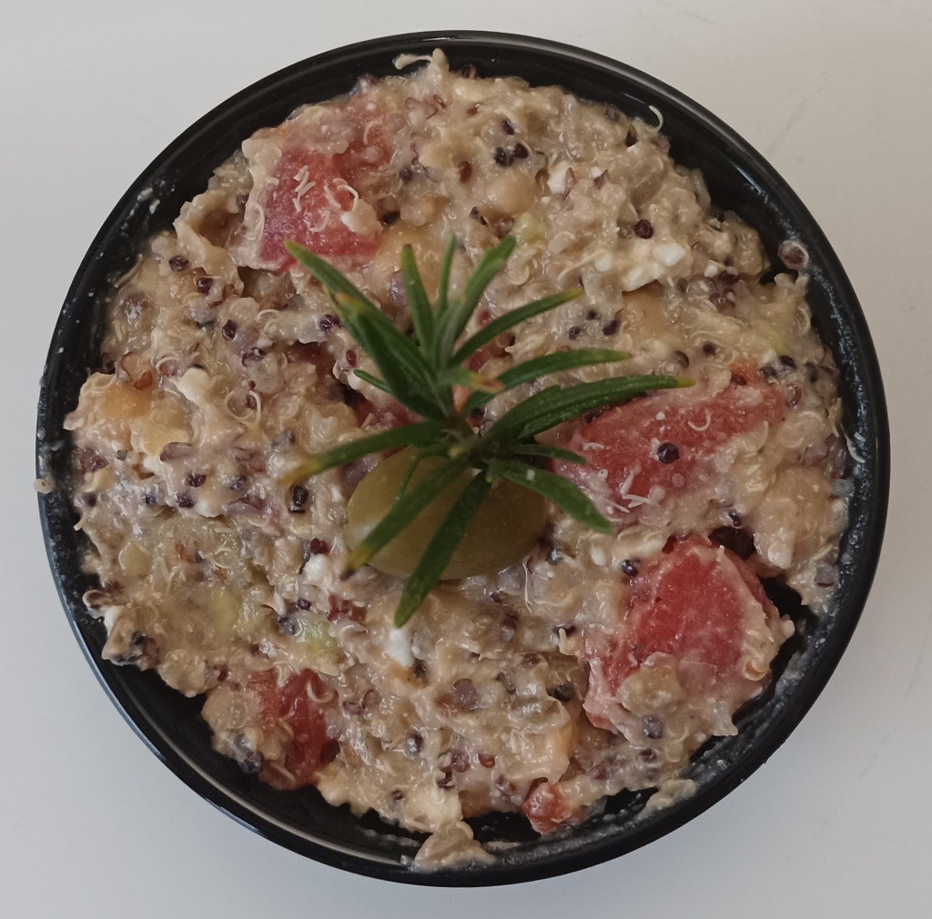 Sirovu kvinoju kuhati (u omjeru 1:3 s malo posoljenom vodom) dvadeset minuta ili dok se sva voda ne upije. Pustiti da se ohladi. Kvinoji dodati slanutak, na sitne komadiće narezani avokado, izmrvljeni feta sir, usitnjene masline i rajčicu, tostirane sjemenke te mješavinu mediteranskih začina i malo soli. Izmiješati te posuti s maslinovim uljem i s malo jabučnog octa i još promiješati.