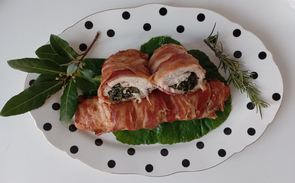 Šnicle moraju biti velike i tanje. Ako su deblje malo istući batom za meso. Posoliti i začiniti ih mješavinom mediteranskih začina. Na jednoj strani šnicle staviti sir i sitno isjeckani lisnati toskanski kelj (prethodno skuhan u slanoj vodi). Zamotati meso i cijelu šniclu omotati tankom slaninom. Ukoliko treba krajevi se mogu učvrstiti drvenim štapićem. Staviti u pleh obložen papirom za pečenje, prekriti aluminijskom folijom i peći u pećnici na 200 stupnjeva. Nakon pola sata maknuti foliju kako bi se meso zarumenilo. Peći još pola sata do 45 minuta.