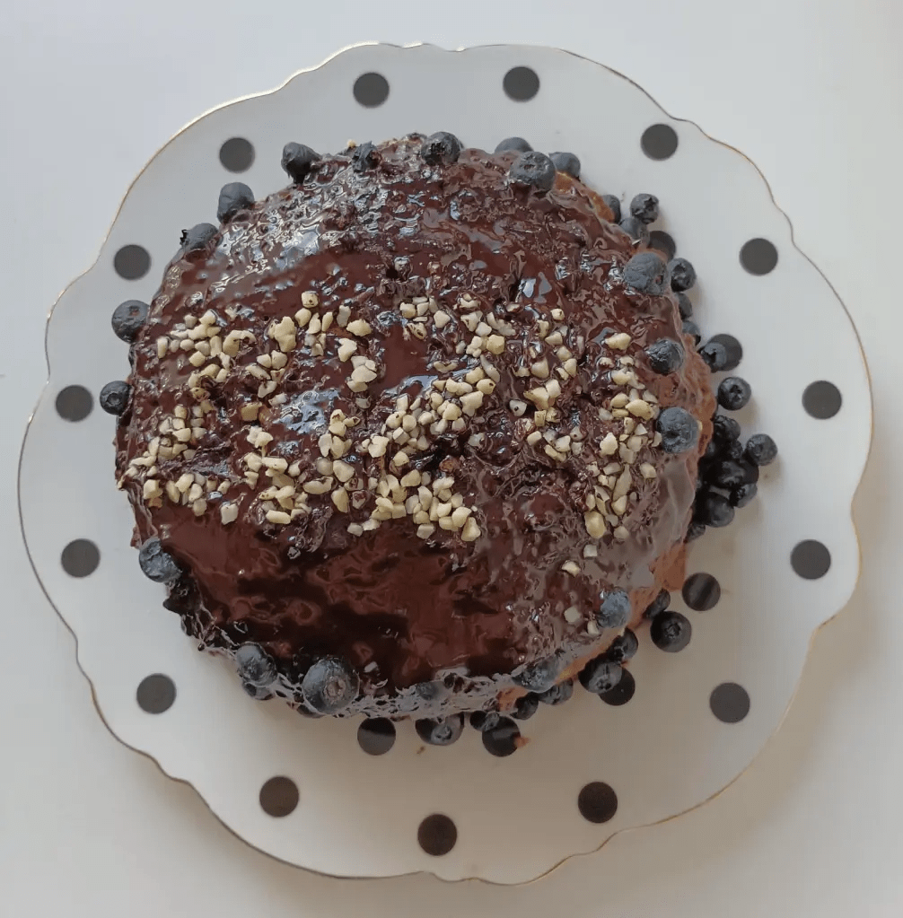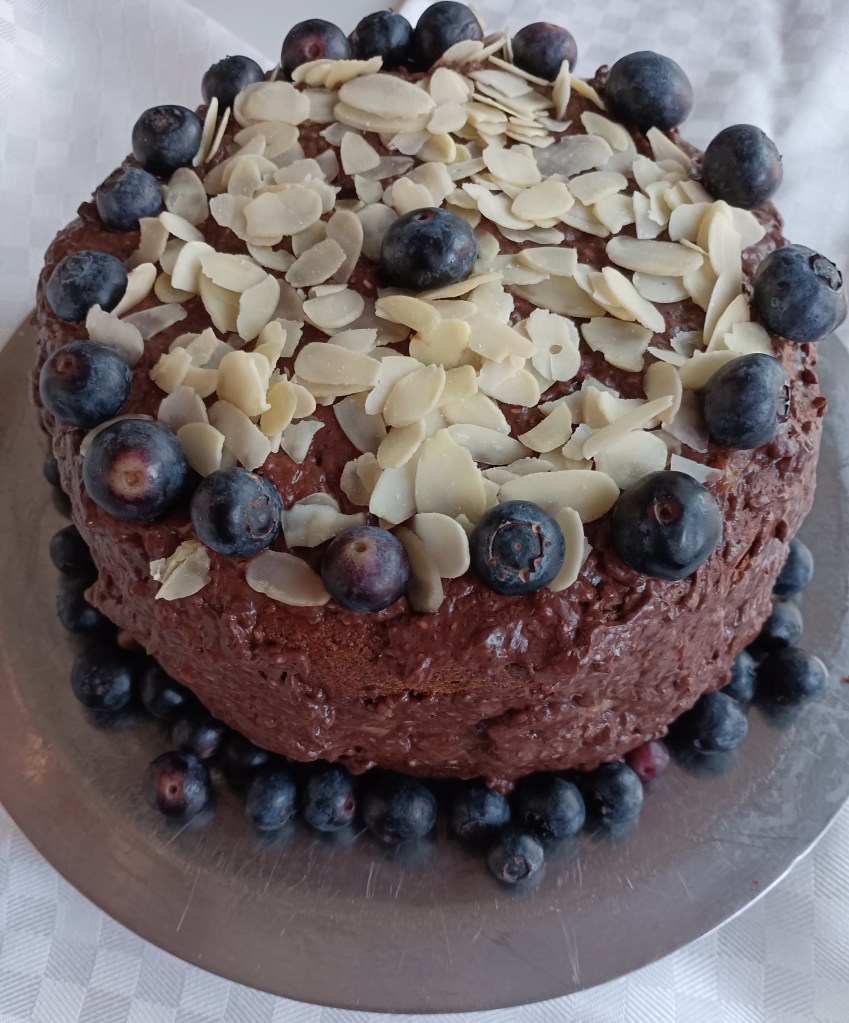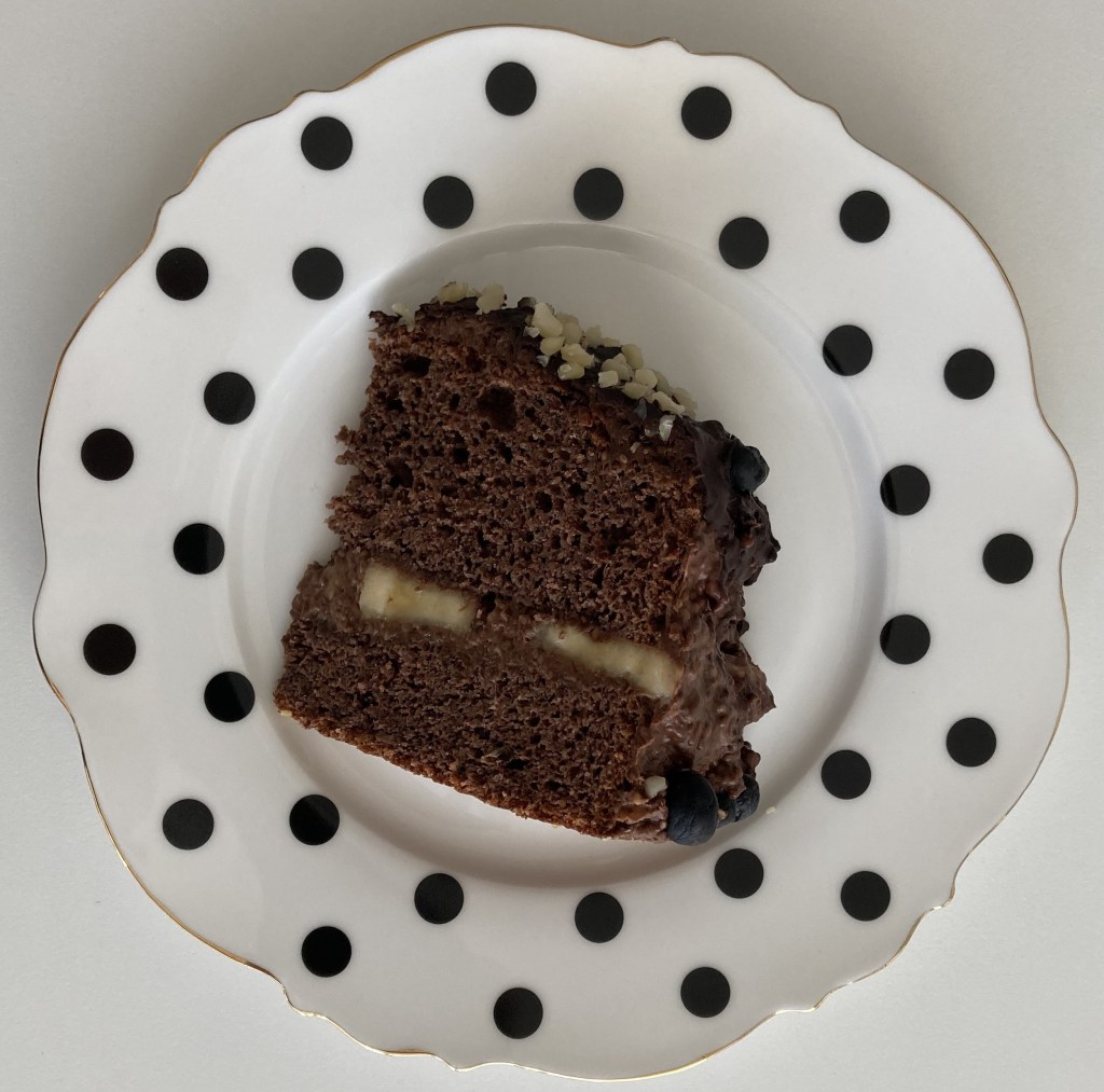 S ovom smjesom filati tortu. Na obje razrezane polovice staviti dio smjese (fil) te na to poslagati kolutiće jedne banane. Spojiti polovice torte i cijelu je obložiti ovim filom. Ukrasiti cijelu tortu borovnicama i/ili bademima. Po želji rastopiti tamnu čokoladu bez šećera i s njom preliti tortu.