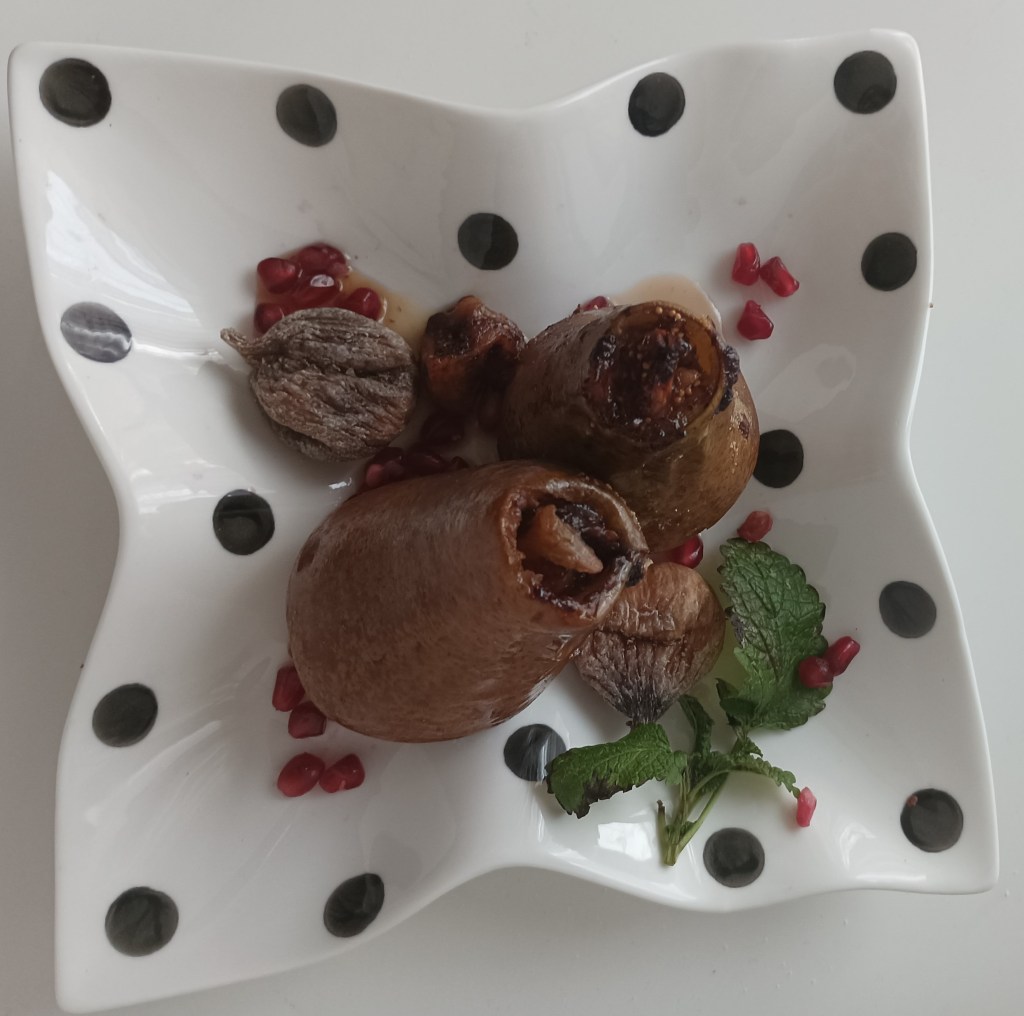Kruške se dobro operu i izdube (ne do kraja kruške) i odstrane sjemenke. U izdubljenje staviti žlicu pekmeza pomiješanog s bademima i dodati izrezanu suhu smokvu koliko stane u otvor. Na vrh staviti malu kockicu maslaca bez laktoze te staviti u pleh obložen papirom za pečenje. Peći u zagrijanoj pećnici na 180 stupnjeva 20-ak minuta.