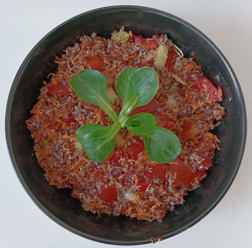 Kvinoju kuhati 20-tak minuta (omjer kvinoje i vode je 1:3). Kada se ohladi staviti u posudu i dodati sitno narezane rajčice, krastavac, papriku i kao začine te mentu. Začiniti s uljem i octom. Poslužiti kao samostalno jelo ili kao prilog.