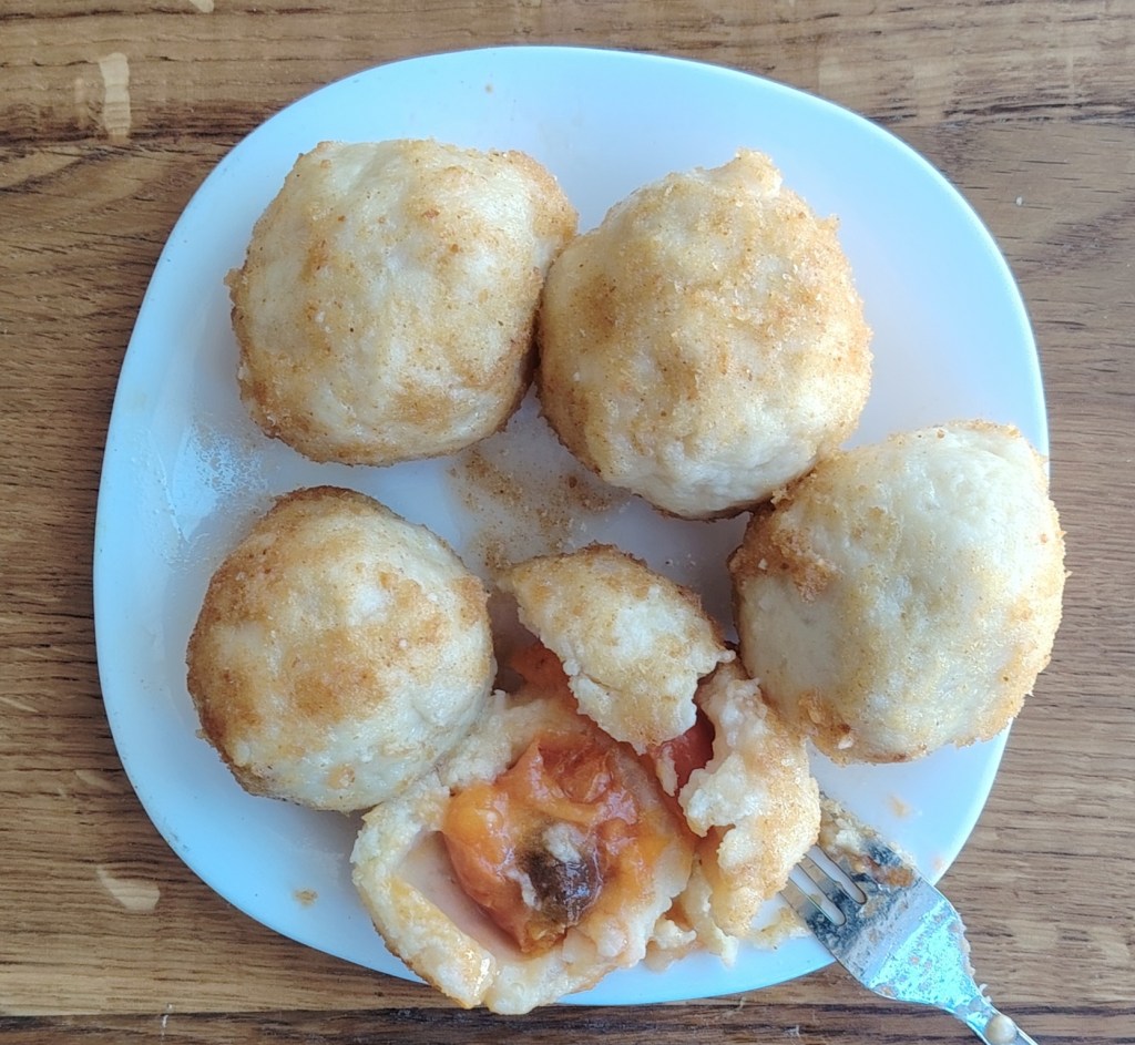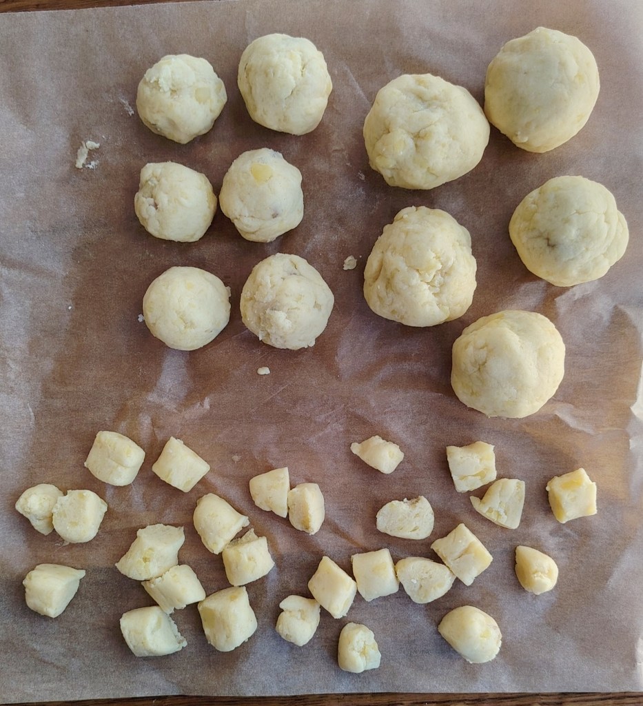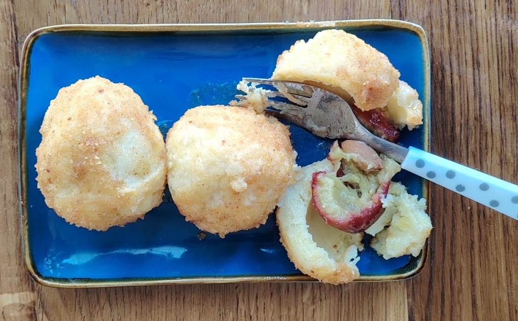 Krumpir se skuha u ljusci, oguli i izgnječi, a kad se malo prohladi doda se jaje, sol i griz te izmiješa. Onda polako treba dodavati bezglutensko brašno toliko da se dobije tijesto koje se ne lijepi, ali nije ni tvrdo. Od tijesta se otkida toliko da se mogu napraviti okruglica veličine po želji (tijesto se može i izvaljati). U sredinu okruglice se može staviti šljiva ili marelica, a izvan sezone ovog voća može se staviti dvije otkoštene datulje (kao u ovom slučaju). Knedle se stave kuhati u proključalu posoljenu vodu. Kuhaju se 10-ak minuta, odnosno dok ne isplivaju na površinu. U tavi se stavi nekoliko žlica ulja i dodaju bezglutenske mrvice. Knedle se uvaljaju u mrvice ili se pospu s mrvicama. Od iste smjese mogu se raditi njoke.