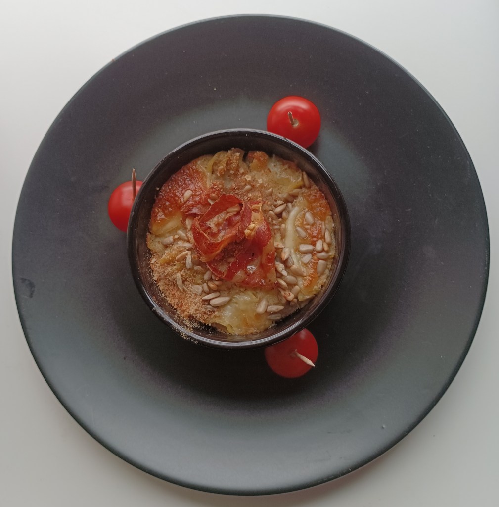 Peče se u pećnici na 200 stupnjeva 20-ak minuta (samo gornji grijači). Kako ne bi gore jako zagorelo pola pečenja držati prekriveno. Kada je gotovo još se može dodati sira ribanca i peršinovog lista.