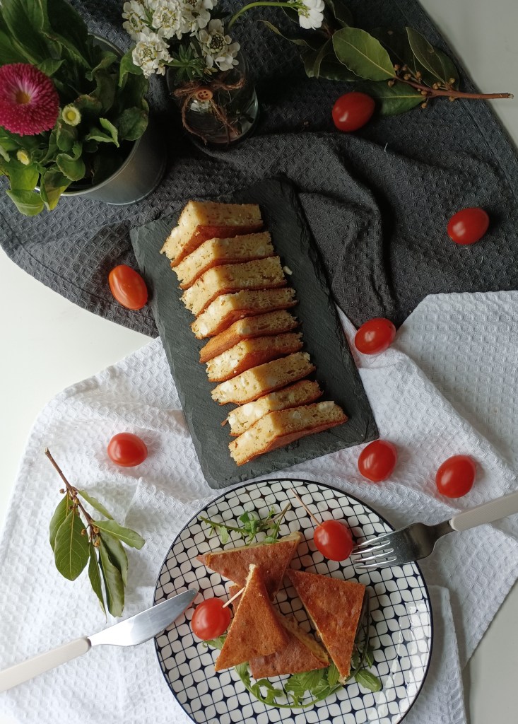 Izmiksati jaja i otopljeni maslac, dodati grčki jogurt, brašno i prašak za pecivo te mlijeko (može i više od zadane količine ako je smjesa gusta). Na kraju dodati izmrvljeni feta sir, ali ne jako sitno. Staviti u pleh srednje veličine prekriven papirom za pečenje i lagano zamašćen. Peći na 180 stupnjeva oko 40 minuta. Izrezati na trokute.