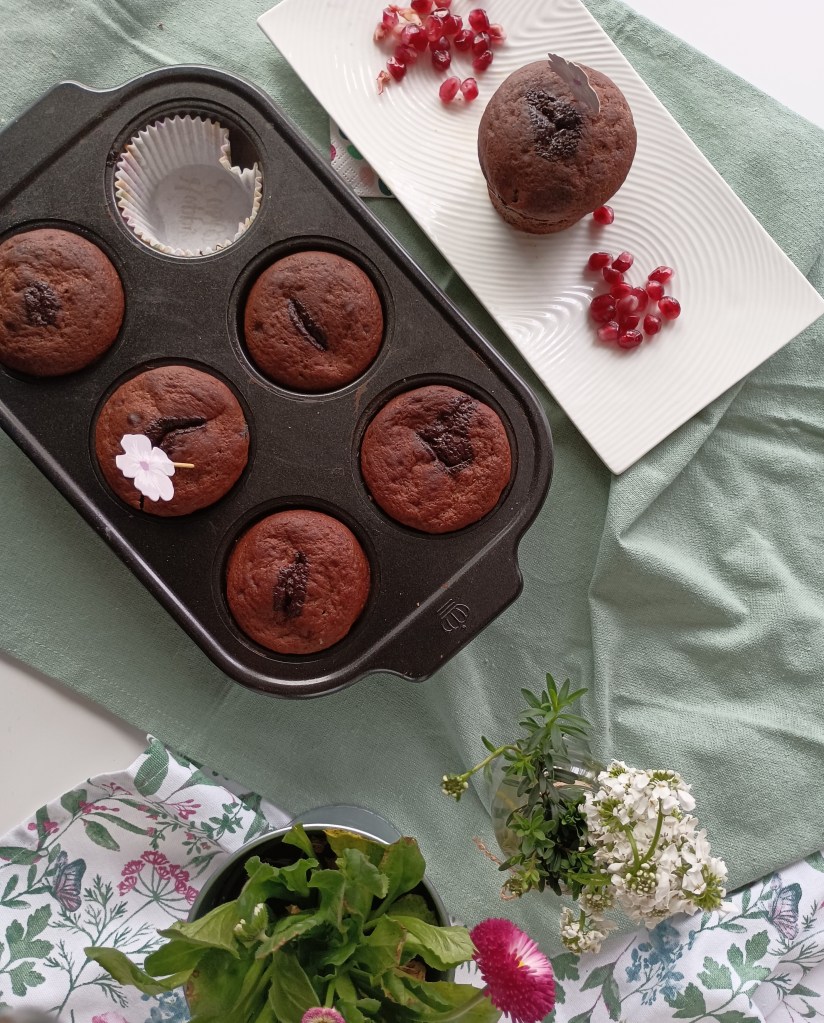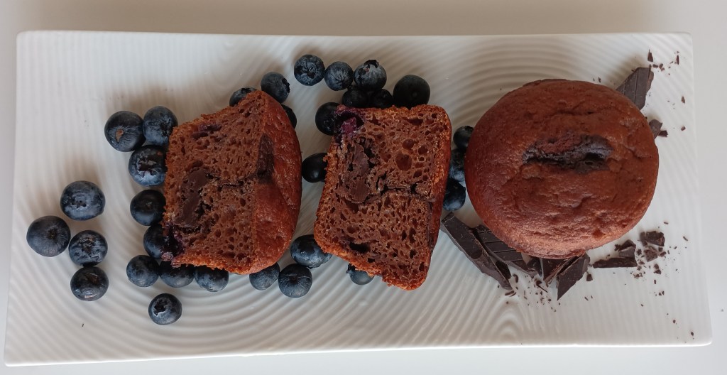 Prvo pomiješati mokre sastojke. Dodati brašno, kakao i prašak za pecivo. Dodati borovnice. Smjesu staviti u otvore kalupa za muffine. U svaki muffin ubosti kockicu čokolade. Peći na 180 stupnjeva oko 30 minuta.