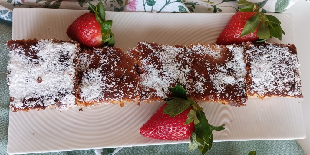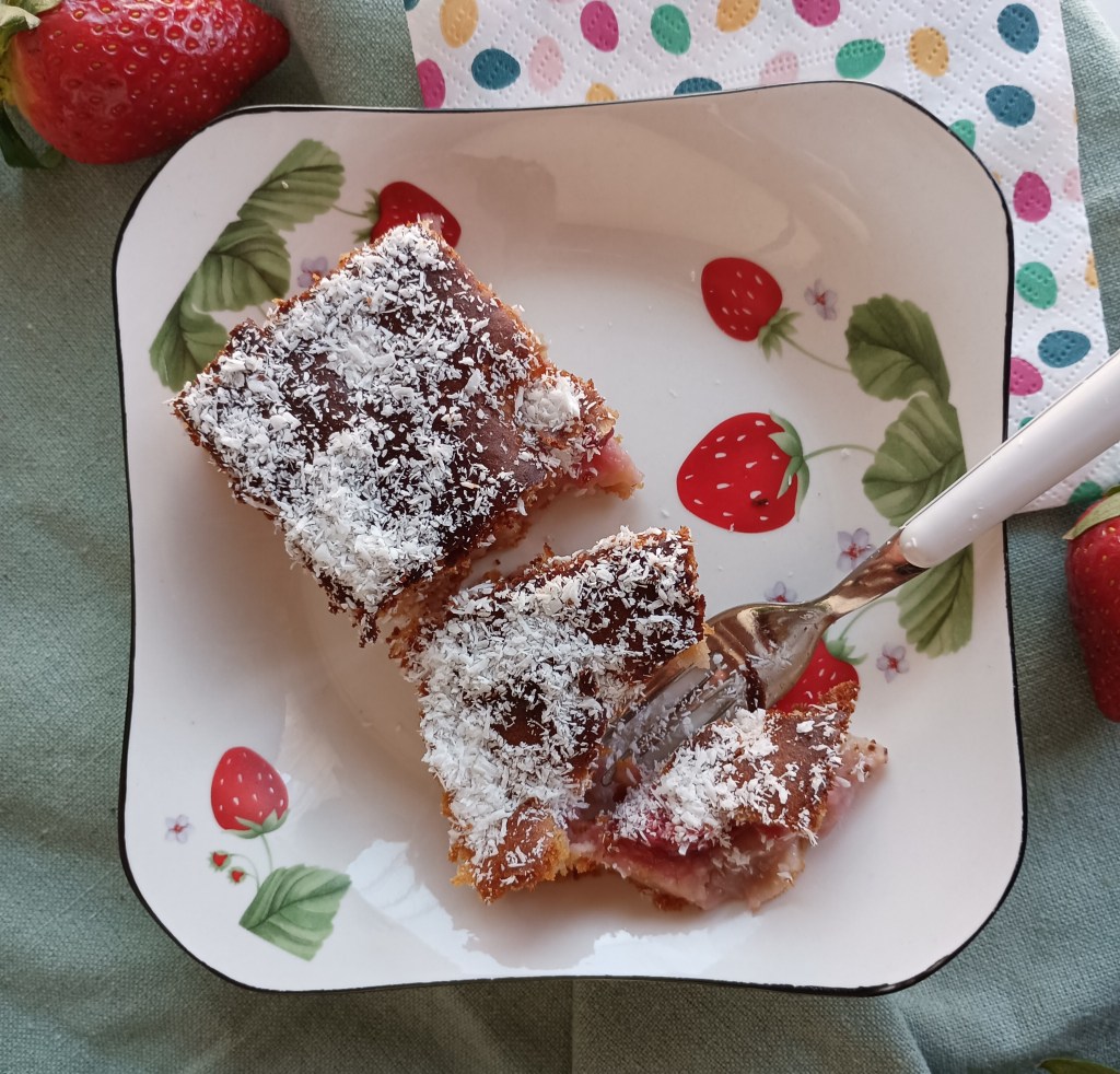 Izmiksati žumanjke, ulje, sladilo i dodati brašno. Kada se izmiješa posebno se smiksaju bjelanjci i lagano s žlicom umiješaju u smijesu. Zatim se dodaju usitnjene jagode i banana. Istrese se na manji pleh (npr. 30×22 cm) obložen i lagano zamašćen papirom za pečenje. Peče se u pećnici zagrijanoj na 180 stupnjeva 45 minuta (kad porumeni prekriti masnim papirom da ne zagori s gornje strane). Kada se ohladi posuti s kokosom. Mogu i druge kombinacije.