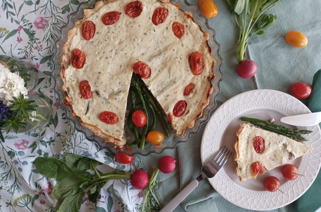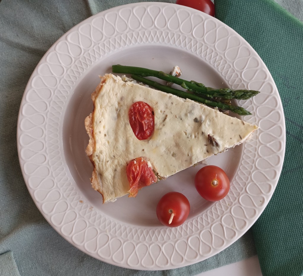 Tijesto se razvalja i/il razvuče rukama i stavi u namašćen kalup koji je predviđen za pečenje pita, a može i u četvrtasti kalup. Napraviti smjesu od sira, jaja, grčkog jogurta, začina. Šparoge prokuhati 5 minuita i poslagati po tijestu u kalupu a preko toga punjenje od sira. Ukrasiti rajčicama. Peći na 190 stupnjeva 30 do 40 minuta.