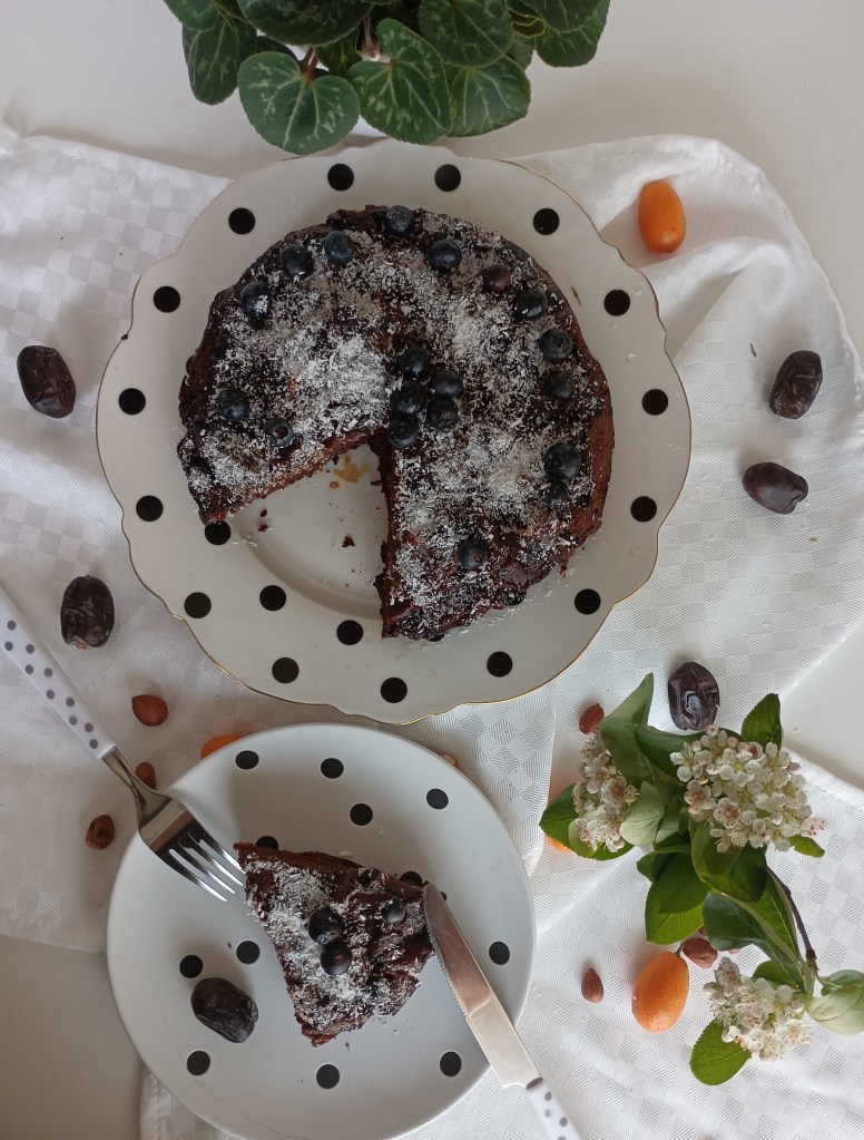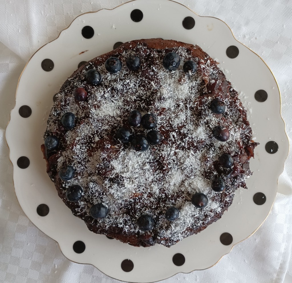 Žumanjci se odvoje od bjelanjaka. Svi sastojci se miješaju uz postepeno dodavanje brašna. Na kraju se kuhačom lagano umiješaju umućeni bjelanjci. Smjesa treba biti ni rijetka ni pregusta. Jabuke se narežu na kockice, dodaju se borovnice i oko 50 do 100 ml vode. Kuha se dok voda ne ispari i sastojci se karmeliziraju. U okrugli namašćen peh prvo se stave karamelizirane jabuke i preko toga se istrese smjesa od tijesta. Stavi se peći na 180 stupnjeva oko 45 minuta. Provjeriti štapićem da li je pečeno. Kada se ispeče torta se okrene se tako da je donji dio gore. Posuti s kokosom i ukrasiti borovnicama.