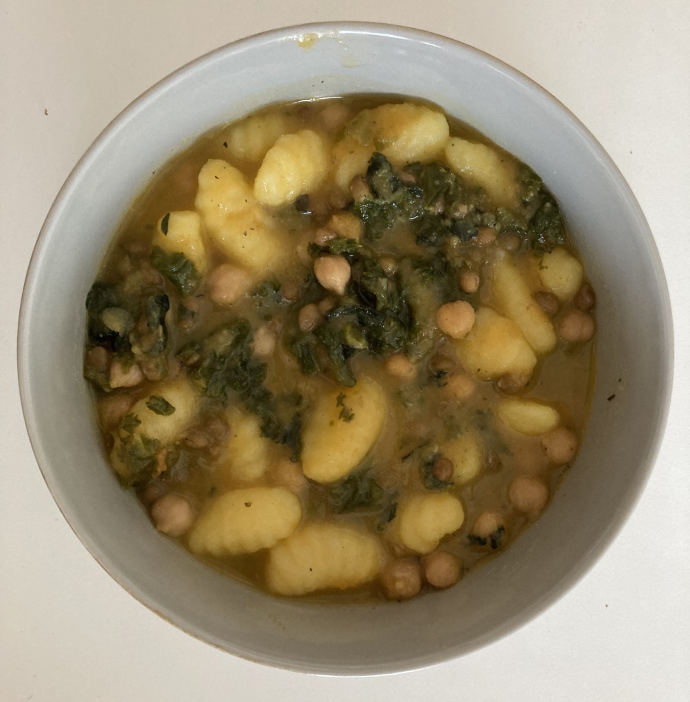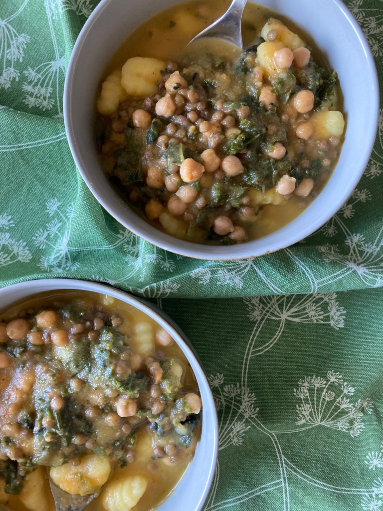 Na luku zdinstati prvo korjenasto povrće (20-30 min). Štapnim mikserom izmutiti povrće uz dodatak, ako je potrebno, tekućine. Posebno skuhati kelj i sitno ga narezati. U smjesu povrća dodati kelj, slanutak (očišćen od kožice i prethodno dobro opran ako je iz konzerve) kao i leću. Dodati tekućine (voda ili temeljac) u varivo da ne bude jako gusto, dodati sol i mješavinu mediteranskih začina. Kuhati 10-ak minuta da se sadržaj prožme. Na kraju posuti s peršinovim listom i jesti samo varivo ili još bolje s bezglutenskim njokama (kao na slikama).