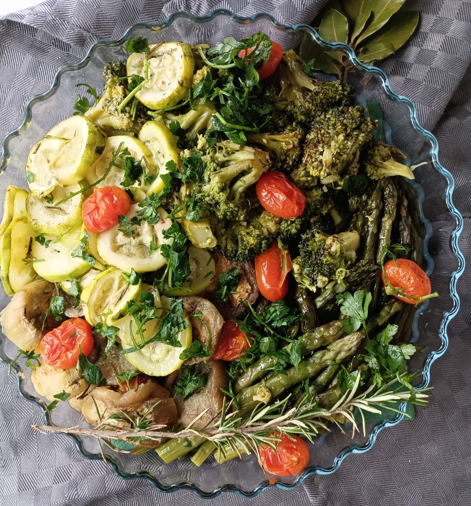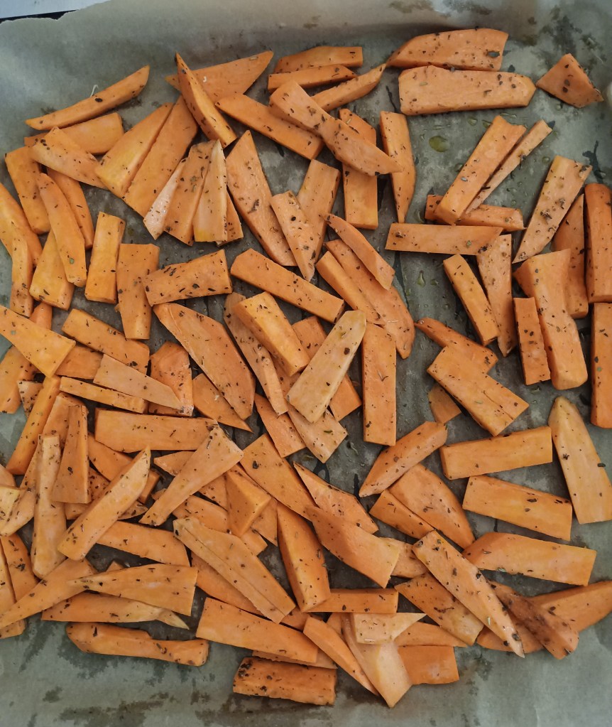 Povrće: Batat izrezati na prutiće i u jednoj posudi pomiješati u maslinovom ulju s mješavinom mediteranskih začina i solju. Staviti na pleh prekriven papirom za pečenje i peći oko 20-tak minuta na 200 stupnjeva (provjeriti je li mekan). Ostalo povrće prije pečenja blanširati u slanoj vodi 5 do 10 minuta. Staviti u pleh prekriven papirom za pečenje, preliti maslinovim uljem i začinima i peći 30-tak minuta na 200 stupnjeva.