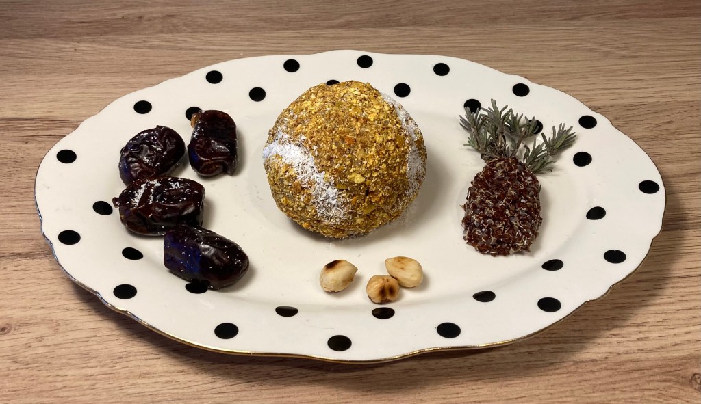 Zatim napraviti jednu veću kuglicu kojoj se u sredinu stavi pola okoštane datulje s lješnjakom na mjestu koštice. Ta kuglica će činiti unutrašnjost teniske loptice.