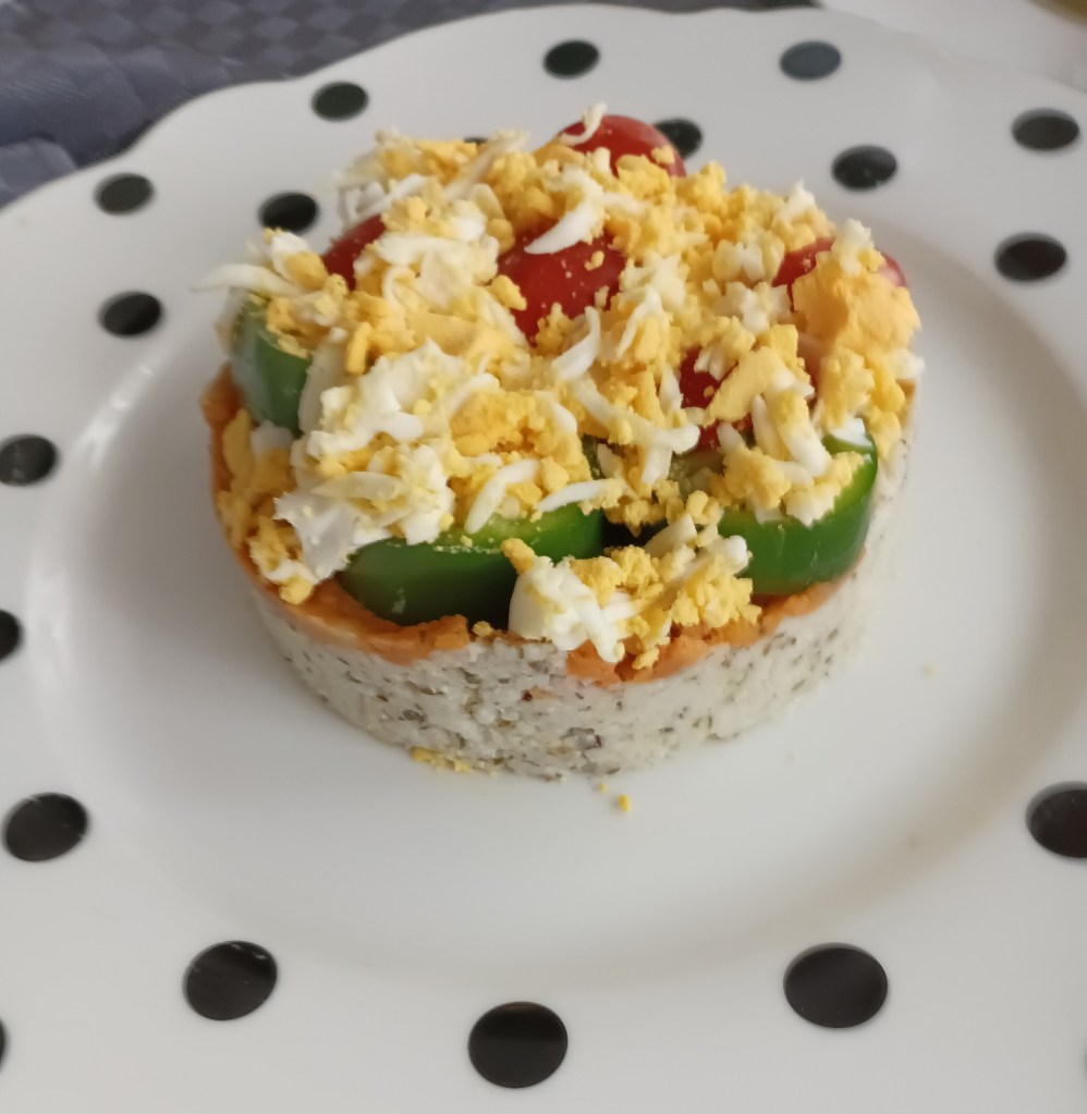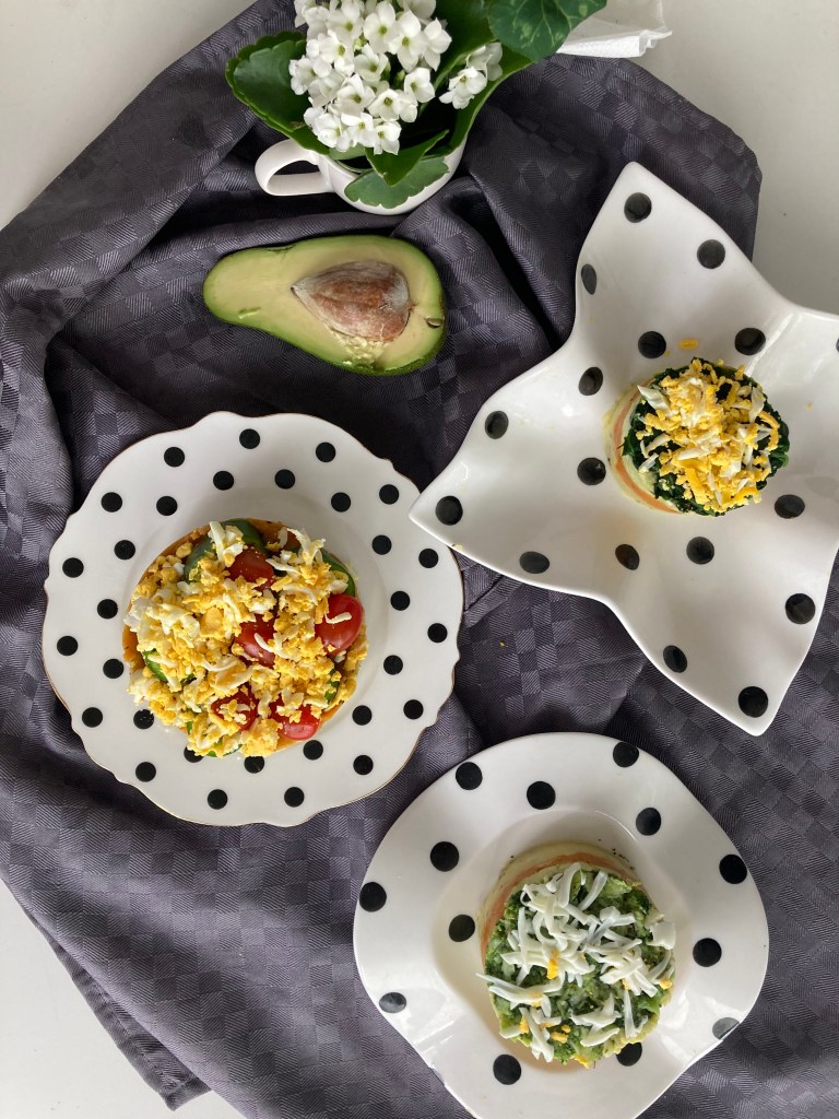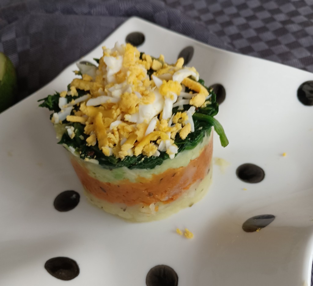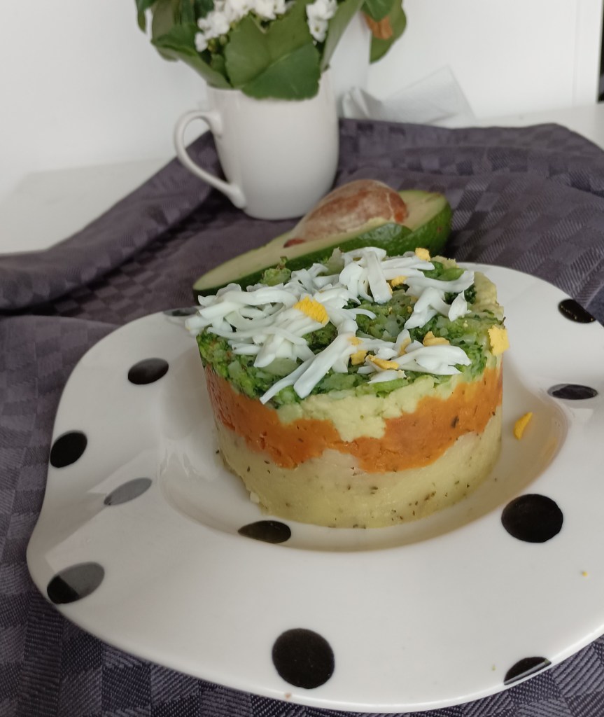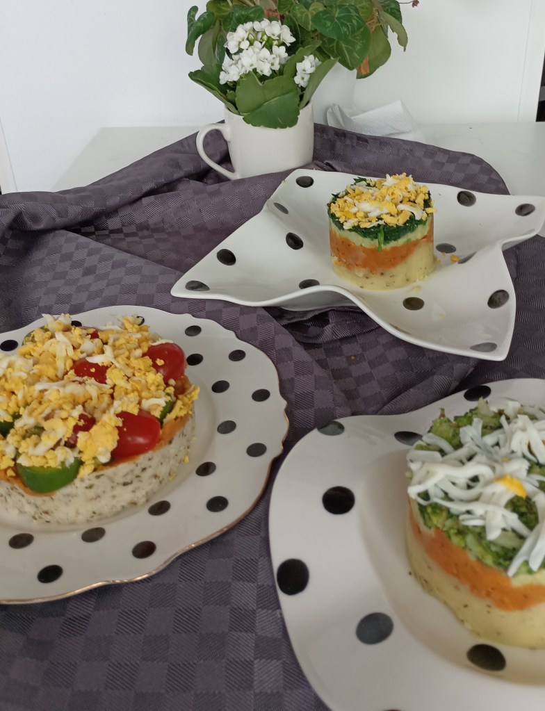 Uzeti kalupe, premazati ih s uljem, staviti u tanjure i slagati (pri tome dobro zgnjećiti za dno tanjura na kojem stoji kalup): krumpir, batat, zgnječeni avokado i špinat. Na vrh naribati kuhano jaje ili sir (Slika 1.). U drugoj salati slagati krumpir, batat, avokado i brokulu. Na vrh naribati kuhano jaje ili sir (Slika 2.). U treći kalup slagati: proso, batat, zelenu papriku i polovice malog paradajza (Slika 3.). Na vrh naribati kuhanio jaje ili sir. Pažljivo izvaditi kalupe. Može se jesti kao lagani obrok ili prilog uz ribu ili meso.