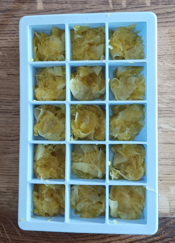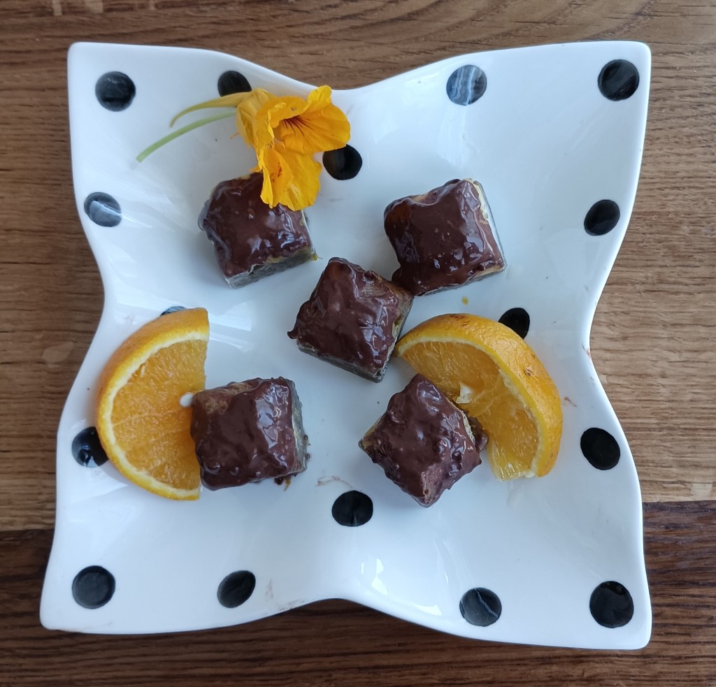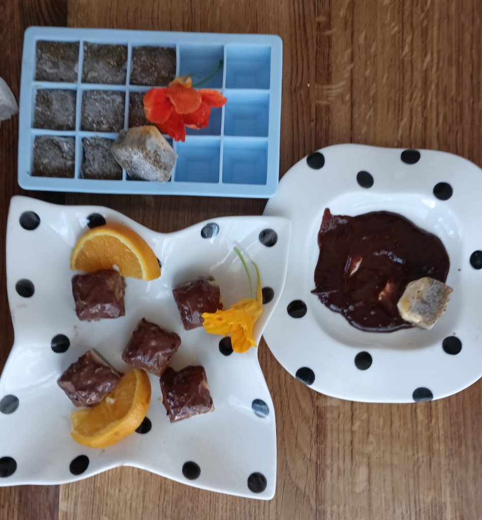 U sok od dvije naranče (oko 150 ml) staviti chia sjemenke i ostaviti da stoji 20-tak minuta. Ako je naranča slatka ne treba sladilo, a ako nije dodati po želji tekućeg sladila. U međuvremenu dvije naranče oguliti i izrezati na kriške i staviti u tavicu da se malo prodinstaju i sok ispari. Ohlađene naranče izrezati na kockice i staviti na dno rupa silikonske modle. Na to staviti zgusnuti sok s chia sjemenkama, poravanati i staviti u zamrzivač. Kada je smrznuto izvaditi iz modle i kocku sa strane naranče umočiti u otopljenu čokoladu (čokolada, kakao, malo maslaca i vode). Ledene kocke su spremne za jesti ili se malo čeka da otpuste.
