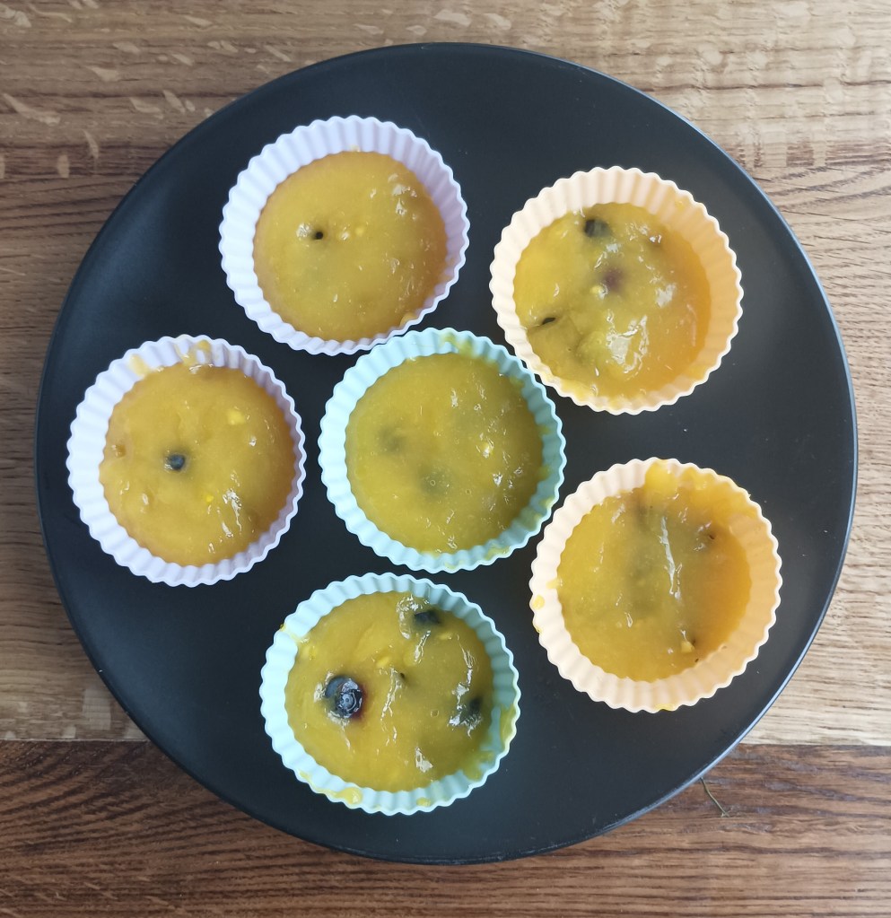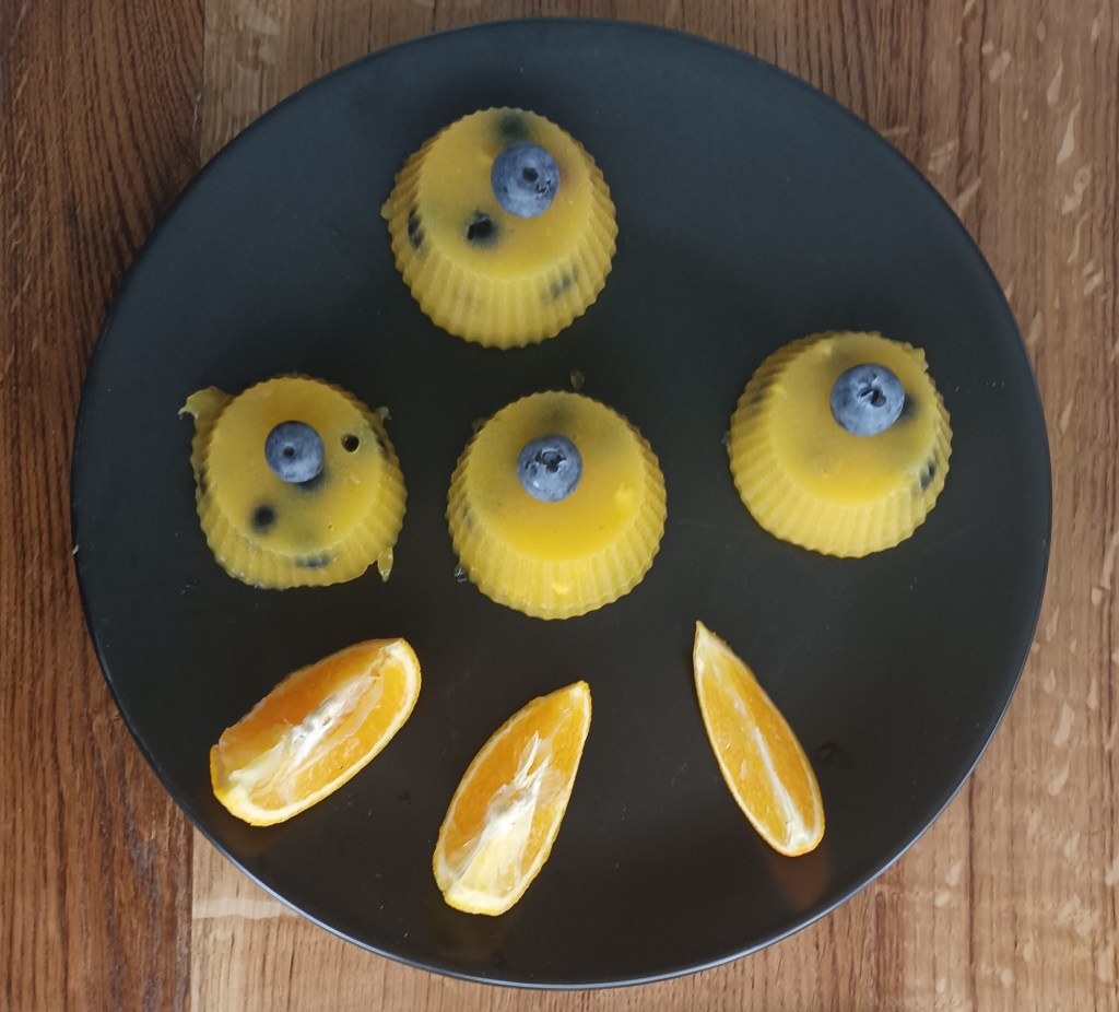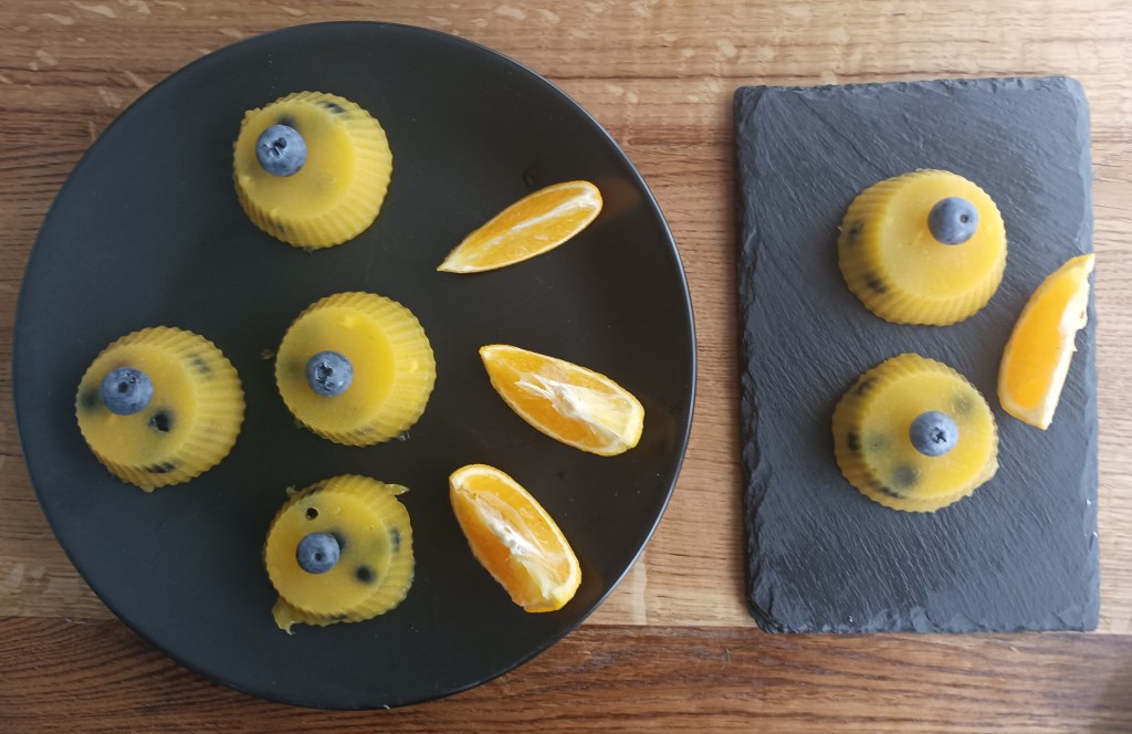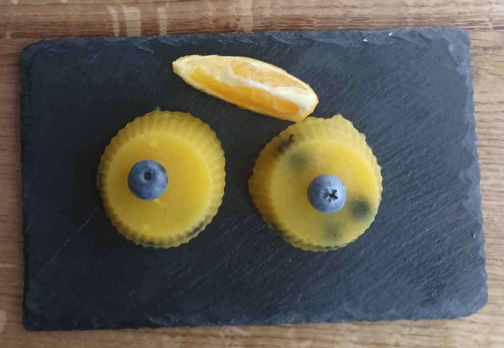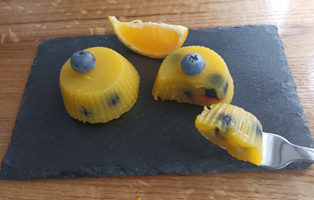 Iscijediti sok od naranči, procijediti da nema koštica i staviti kuhati (dodati sladilo ako želite). Smjesu za puding pomiješati s malo soka da postane tekuće. Kada provrije sok izmješati smjesu pudinga. Sve se radi na isti način kao da se priprema puding u mlijeku. Kuhano je nakon par minuta. Sa žlicom sipati u silikonske košarice do malo više od pola. U svaku košaricu umetnuti nekoliko bobica borovnica. Ostaviti hladiti (ne mora u hladnjak). Kada je ohlađeno lagano se žele izvadi iz kalupa. Po želji dodatno ohladiti u hladnjaku.