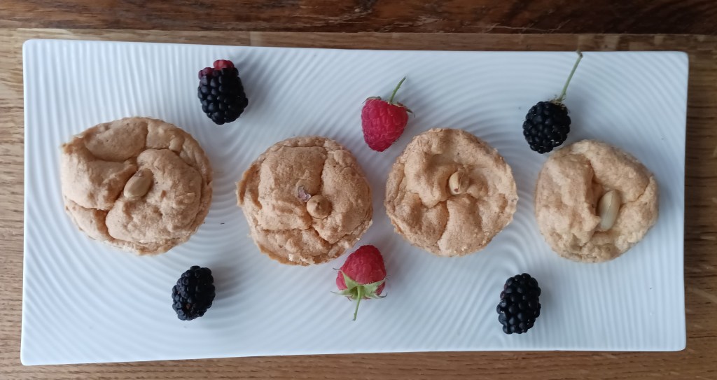 U bjelanjke staviti malo soli i dobro izmiksati, dodati maslac i samljevene kikirikije. Staviti u silikonske košarice i peći (sušiti) na 160 stupnjeva 30-tak minuta.