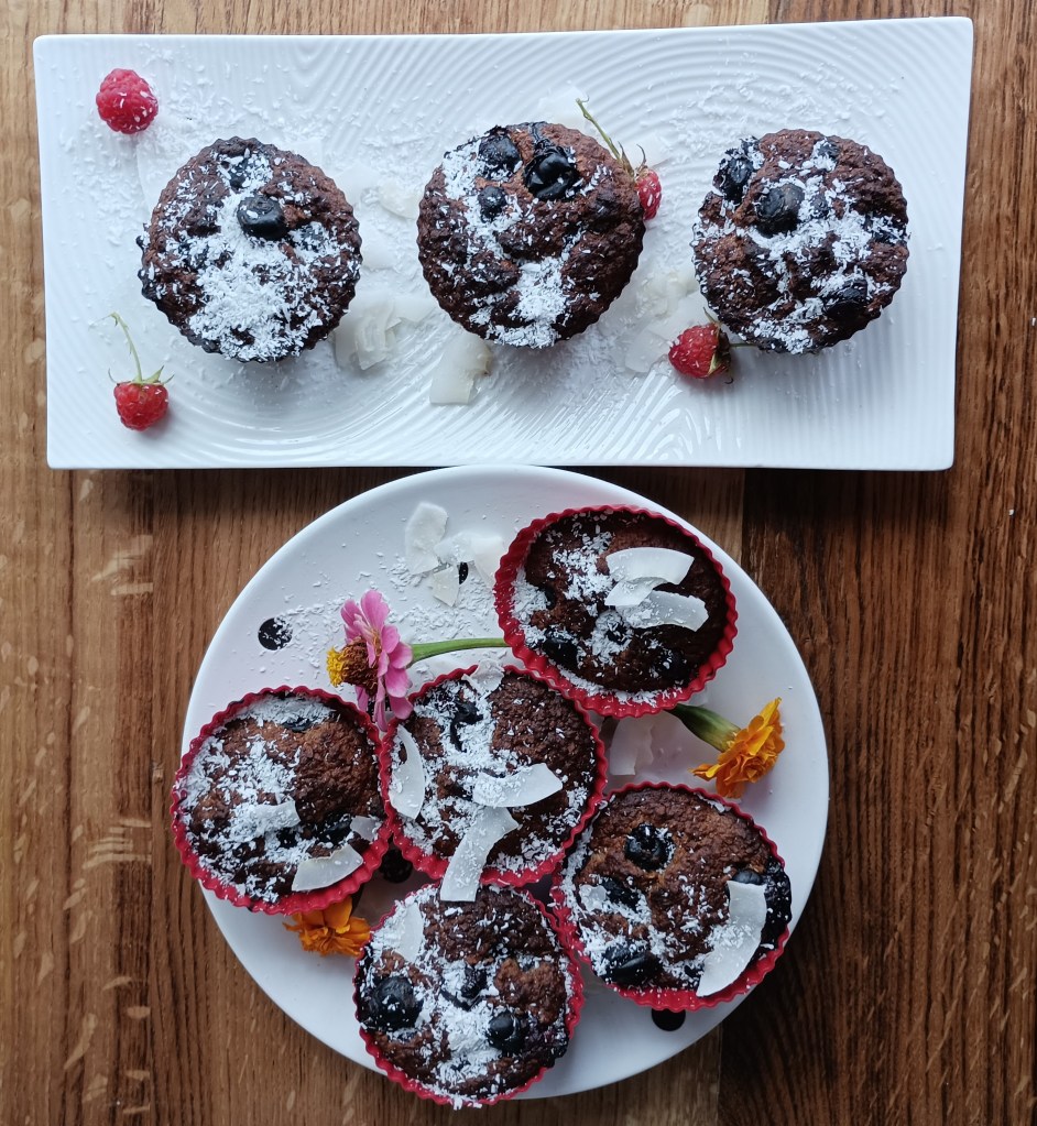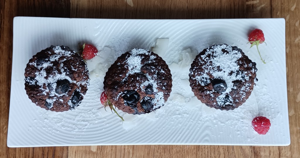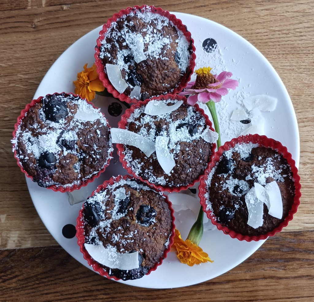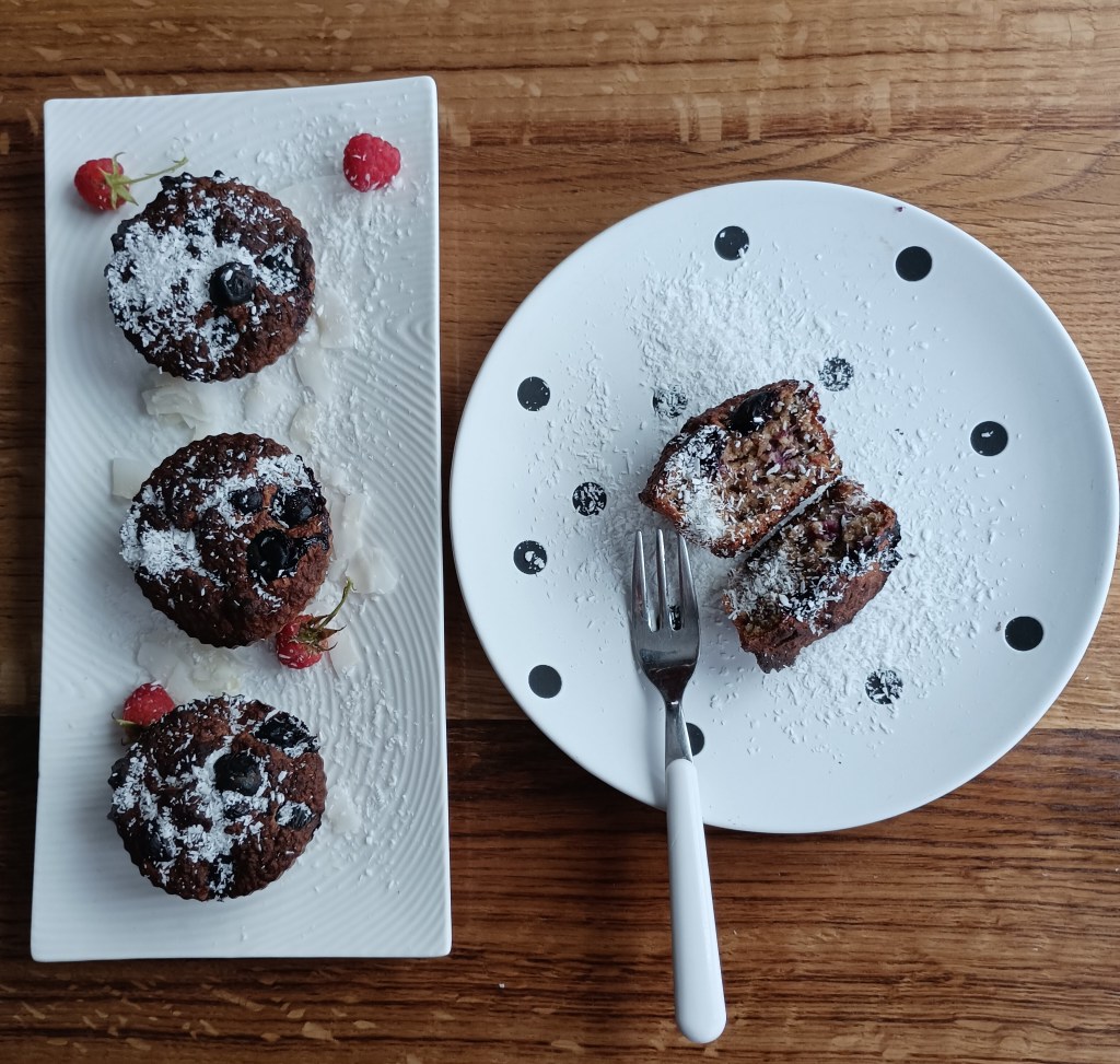 U multipraktik staviti jaja i zgnječene banane te miksati, dodati zobene pahuljice, cimet i prašak za pecivo. Još malo miksati i sipati u silikonske kalupe košarice bez premazvanja (neće se zalijepiti). U svaku košaricu ugurati nekoliko borovnica. Peći na 180 do 200 stupnjeva tridesetak minuta (ovisno o pečnici). Posuti kokosom.