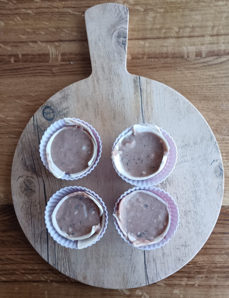 Podloga za košarice; Tortilju zamotati kao palačinku i izrezati na dijelove širine koliko su visoke silikonske košarice, odnosno udubljenja u kalupu muffina (u receptu su male tortilje, 6 komada). Izrezane trake staviti po rubu u silikonsku košaricu i na dno kalupa, bez potrebe podmazivanja. Puniti s nadjevom (u ovom slučaju su to slatke košarice). Za slane košarice trake tortilja stavljati po rubu udubljenja kalupa za muffine koji se lagano podmažu (a isto mogu i u silikonske kalupe jer je lakše za vađenje ispečenih košarica). Na vrh punjenja staviti mozzarellu ili neki drugi topivi sir (vidjeti slike).