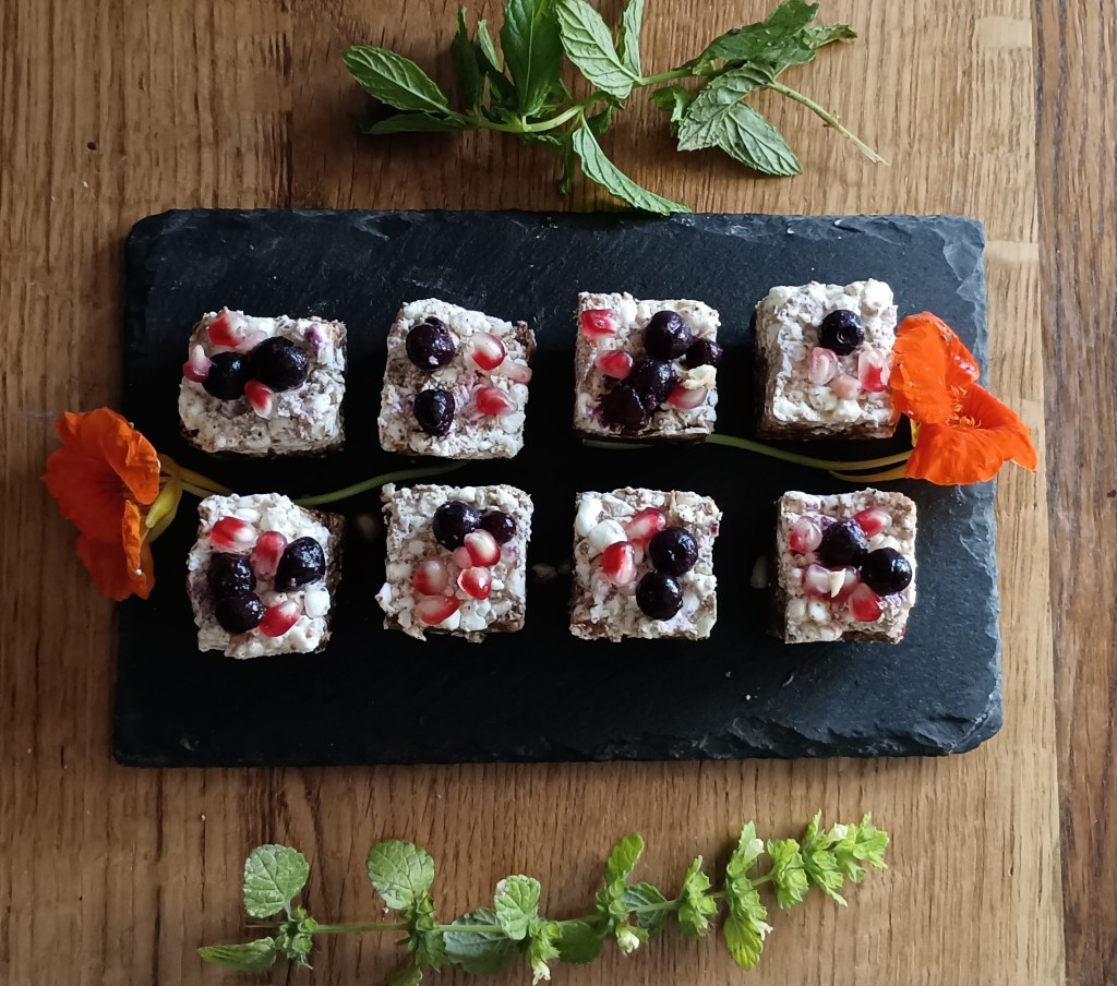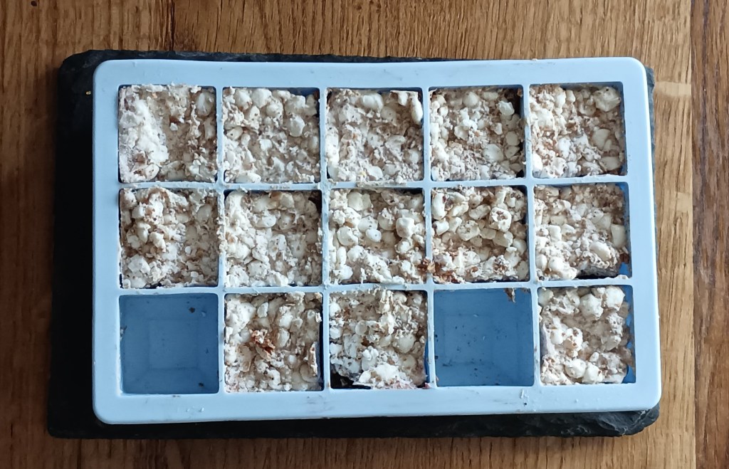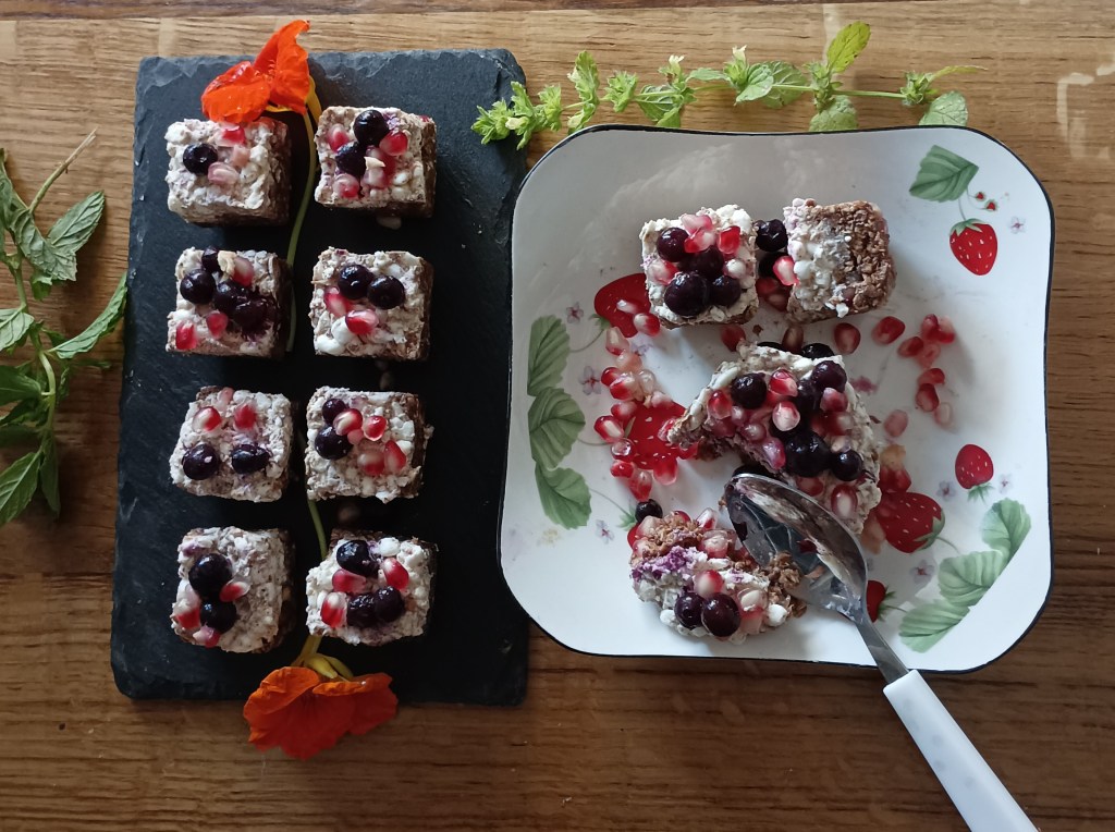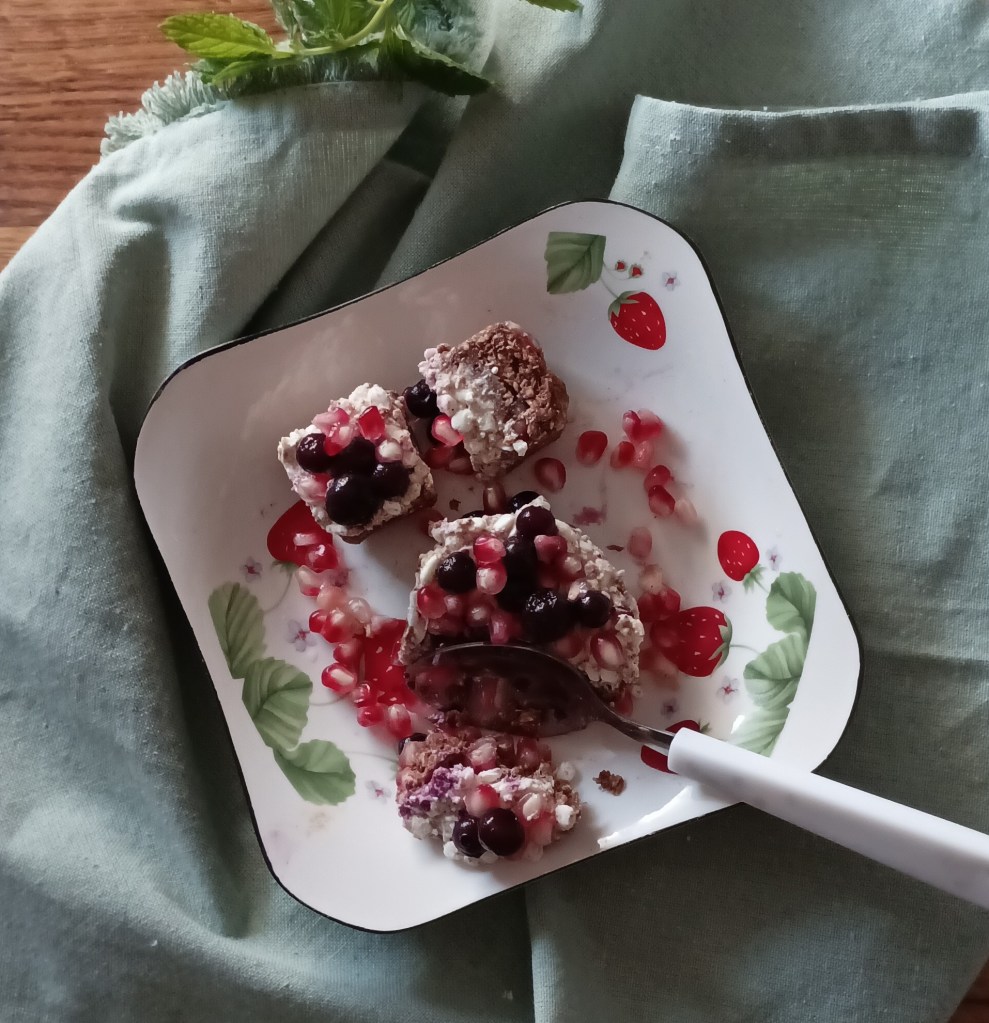 Banane zgnječiti (ne miksati), dodati zobene pahuljice, kokos, kakao, nekoliko žlica zrnja šipka. Dobro umiješati i s malom žlicom masu stavljati u silikonski kalup za kocke (može i neki drugi silikonski kalup s drugim onlicima). Udubljenje napuniti i utisnuti nešto više od pola. Zrnati sir (ovdje je u receptu) pomiješati s rogačem (ili nekim drugim sladilom) i dopuniti udubljrnja. Kalup staviti na hlađenje u zamrzivač na sat vremena. Izvaditi, ukrasiti sa šipkom i/ili drugim bobičastim voćem i poslužiti.