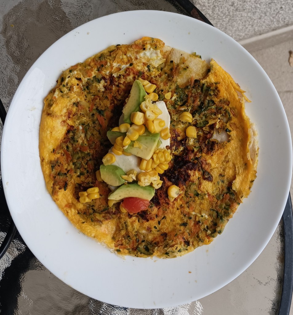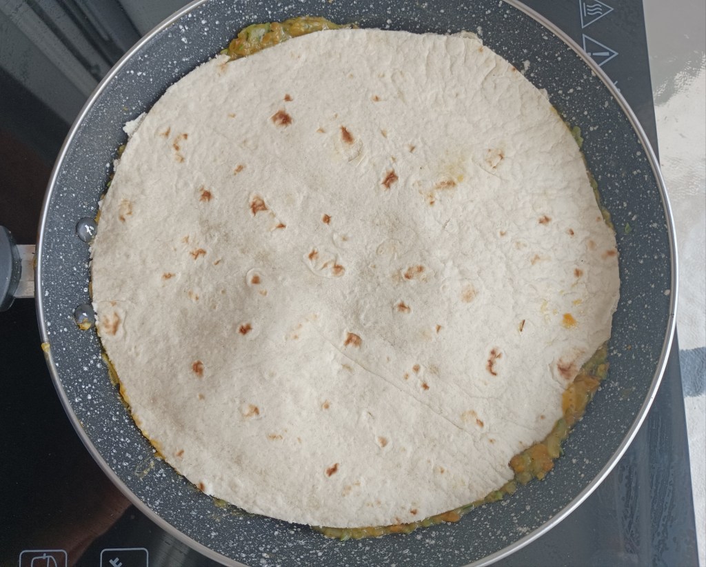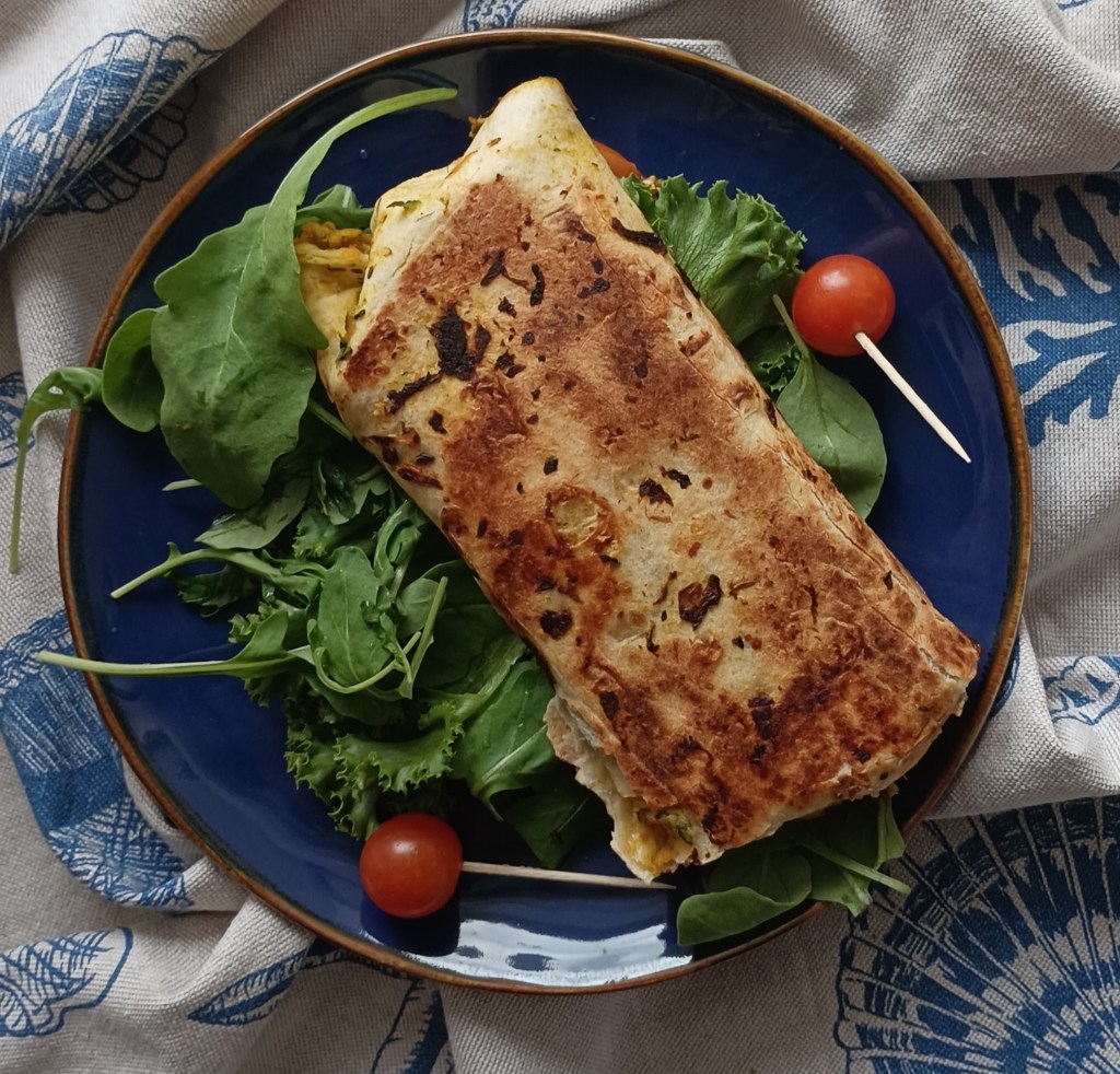 Dinstati ribanu tikvicu i ribanu mrkvu desetak minuta. Ocijediti odvojiti pola smjese staviti na tavu te preliti s jednim umućenim jajetom i peći na laganoj vatri. Kada je jaje gotovo pečeno staviti tortilju preko smjese i peći još malo na toj strani. Okrenuti tortilju s pečenim nadjevom i dodati sirovi nadjev po želji. Ovdje je: avokado, šnite mozzarelle, mali paradajz i kukuruz. Zamotati tortilju sa sve četiri strane (učvrstiti ako treba čačakalicom) i staviti na tavu (lagana vatra) još koju minutu s obje strane da se sir rastopi. Na tanjur staviti dva lista salate i rikulu pa tortilju. Poslužiti toplo.
