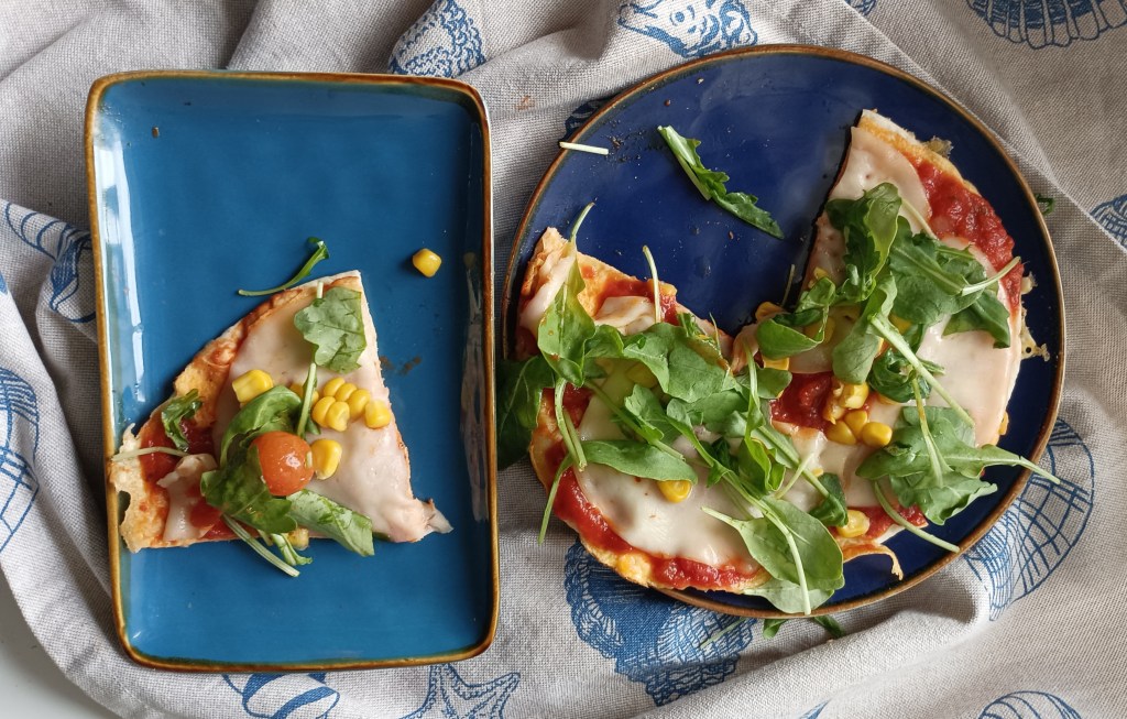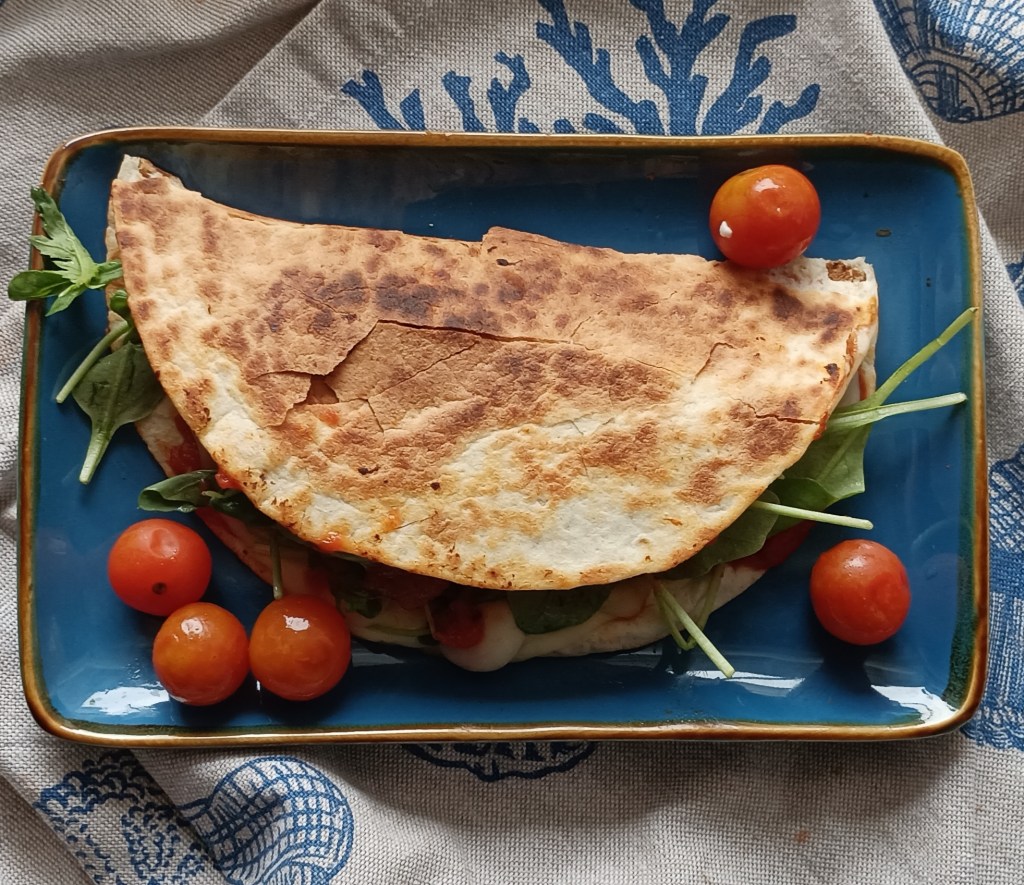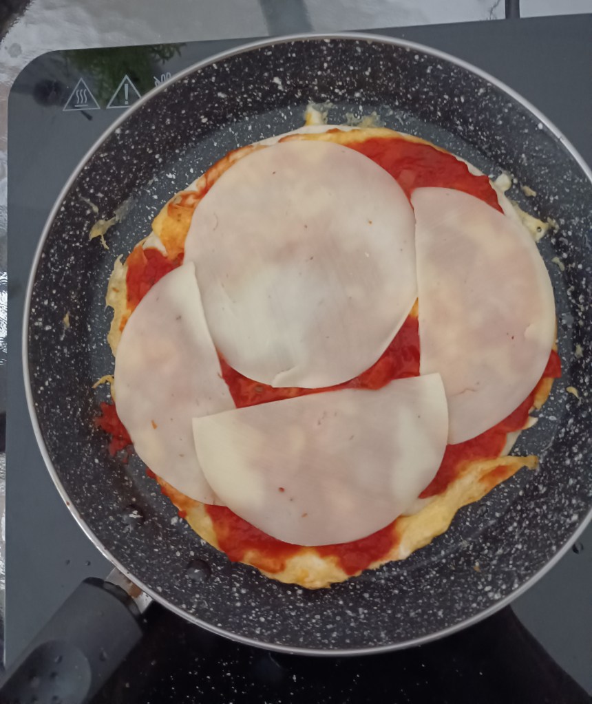Izmutiti jaje, začiniti i istresti na tavu. kada je skoro pečeno staviti tortilju na jaje. Nakon 2 do 3 minute okrenuti tortilju. Premazati s paradajzom i staviti začine po želji (može i bijeli umak sa začinima) i origano te posložiti tanke fete mozzarelle ili nekog drugog sira bez laktoze da se otopi. Peći nekoliko minuta. Posebna napomena da se sve peče na jako blagoj vatri kako tortilje ne bi izgorele. Izvaditi tortilju i dovršiti punjenje po želji kako inače stavljate npr. fete pureće kuhane šunke, masline, kukuruz… i na kraju svakako rikula koja daje poseban ukus.