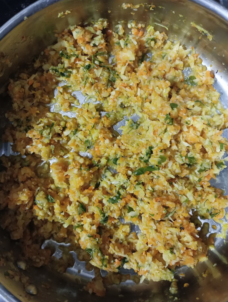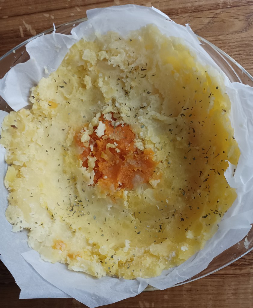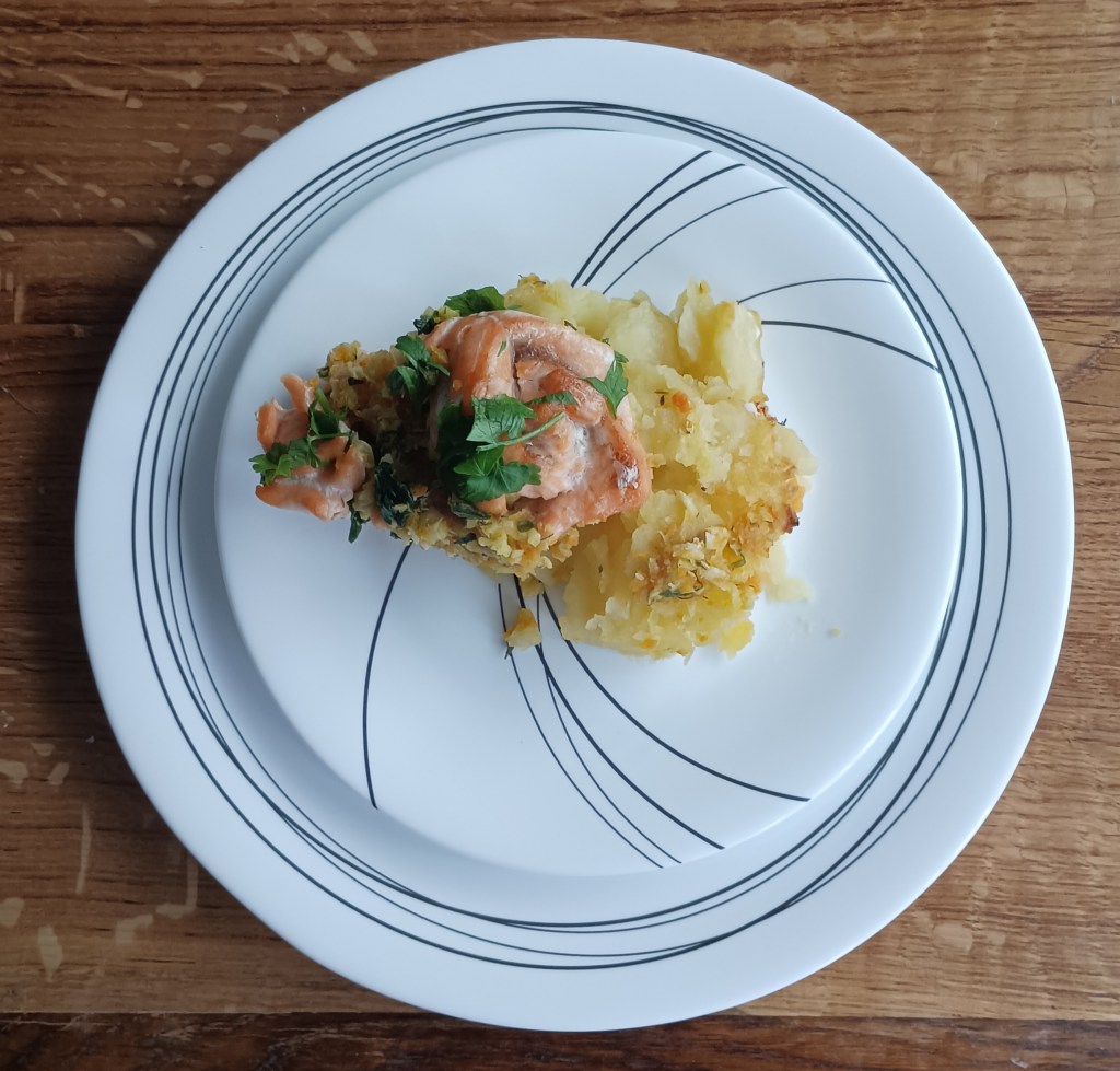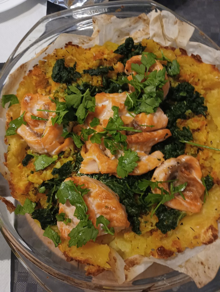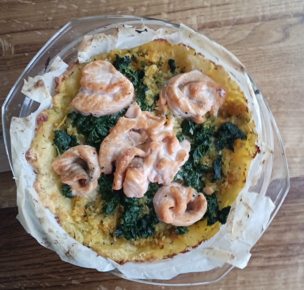 Krumpir i batat skuhati u ljusci, a kada su gotovi oguliti ih te zgnjećiti u posudi za pečenje tako da u sredinu ide batat, a okolo krumpir. Začiniti i preliti s dvije žlice maslinovog ulja i staviti da se zapeče (kako bi dobio koricu) nekih 20-tak minuta. Dok se peče dinsta se korjenasto povrće i skuha blitva, odnosno kelj. Kada je “podloga” dobila koricu stavi se u udubljenje dinstano povrće i skuhana blitva. te na vrh stavi file lososa u obliku kockica i ako se može zarola se. Losos je dovoljno malo posoliti bez dodatka ulja, stavi se peći toliko dugo da se losos ispeče (oko 20 minuta na 200 stupnjeva).