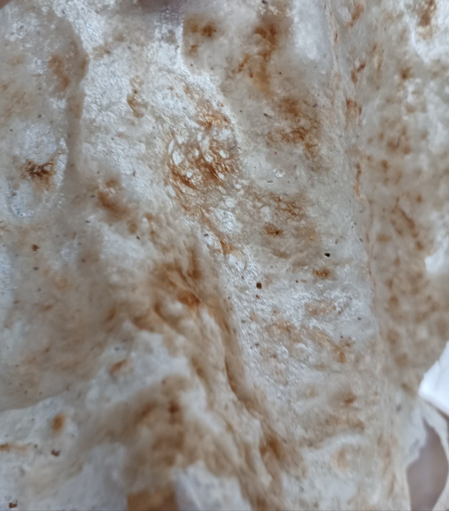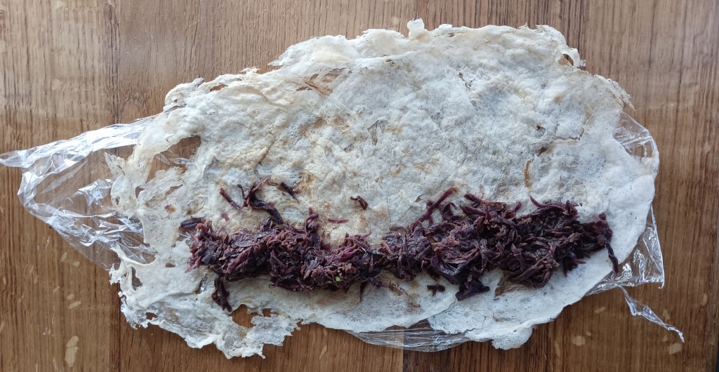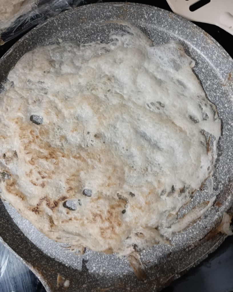 Umutiti sastojke tako da smjesa ne bude ni jako rijetka ni gusta (Slika 1.). Na zagrijanoj tavi bez masnoće (mora biti suha) četkicom se nanosi smjesa pažljivo da se popuni cijela površina. Prvi premaz se prođe dio tave, a onda se još veše puta pažljivo prelazi s četkicom (svaki put umočenoj u smjesu) i popunjavaju samo praznine (nije dobro prelaziti preko već zaljepljene smjese jer se taj dio onda odvaja od tave) (Slika 2.). Peče se dok se ne počne odvajati od površine (malo više od minute), okrenuti i peći još jednu minutu. Izgled dobro ispečene kore pokazuje Slika 4. (ali ne smeta ni pokoja rupa jer se preklopi motajući je s punjenjem). Ispečena kora mora se složiti na prozirnu foliju kako se ne bi slijepila s korama koje će se slagati iznad nje (nije kao palačinka koja se slaže jedna preko druge bez ljepljenja). Drugu ispečenu koru preklopiti u dijelu s prvom (trećinu). Preko prve dvije preklopljene kore staviti prozirnu foliju i tako redati, po dvije preklopljene kore, dok sve kore ne budu ispečene (slika 5).
