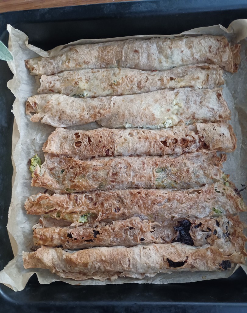 Na koru staviti smjesu nadjeva i zarolati (slika 6, i 7.). Dvije prerklopljene kore s dosta nadjeva ne mogu se motati u zvrk. Ako se to želi onda treba preklopiti 3 kore i staviti manje punjenja. Iz slike 8. i 9. vidi se osam gotovih rola pite što znači da se iz navedene količine brašna i vode dobije 16 kora (i još par neuspjelih). Prema tome može se planirati eventualno povećanje mjera iz recepta. Isto tako se vidi kako su ovako rolane dvije kore mjera za pleh od pećnice.