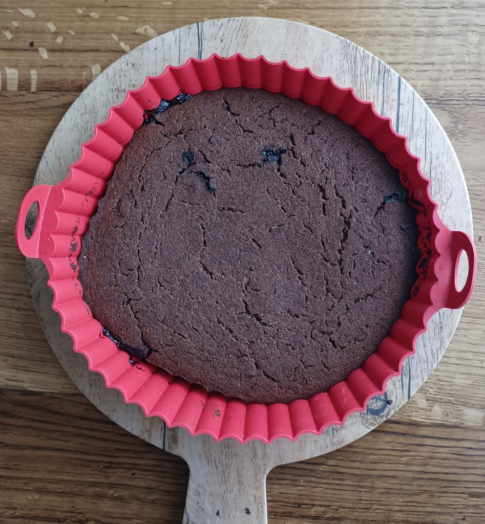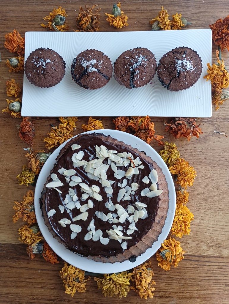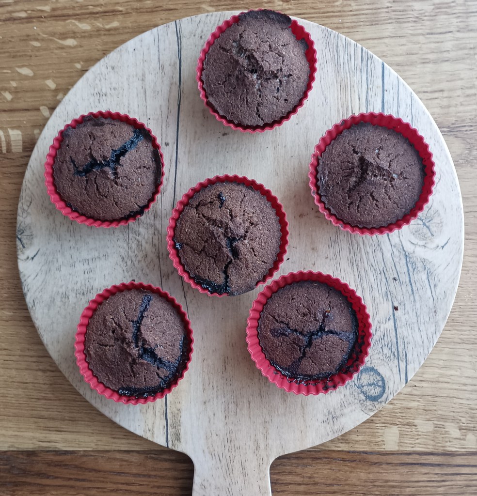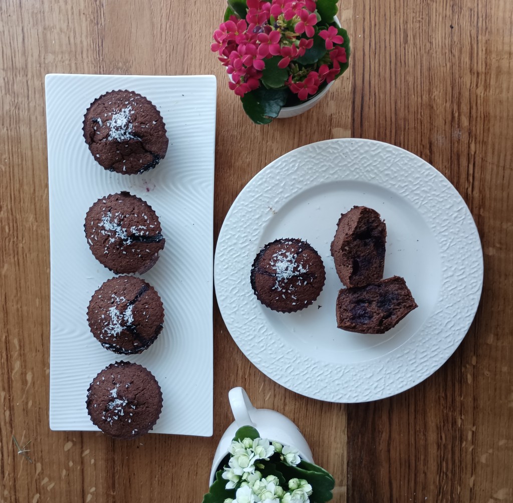 Smjese ima dosta pa se može dio istresti u kalupe za muffine, a dio u okrugli pekač od silikona (može i četvrtasti pleh). Peći na 190 do 200 stupnjeva 30 do 45 minuta ovisno o pećnici (probati s drvenim štapićem). Kolač iz kalupa može se preliti s otopljenom tamnom čokoladom i posuti listićima badema.