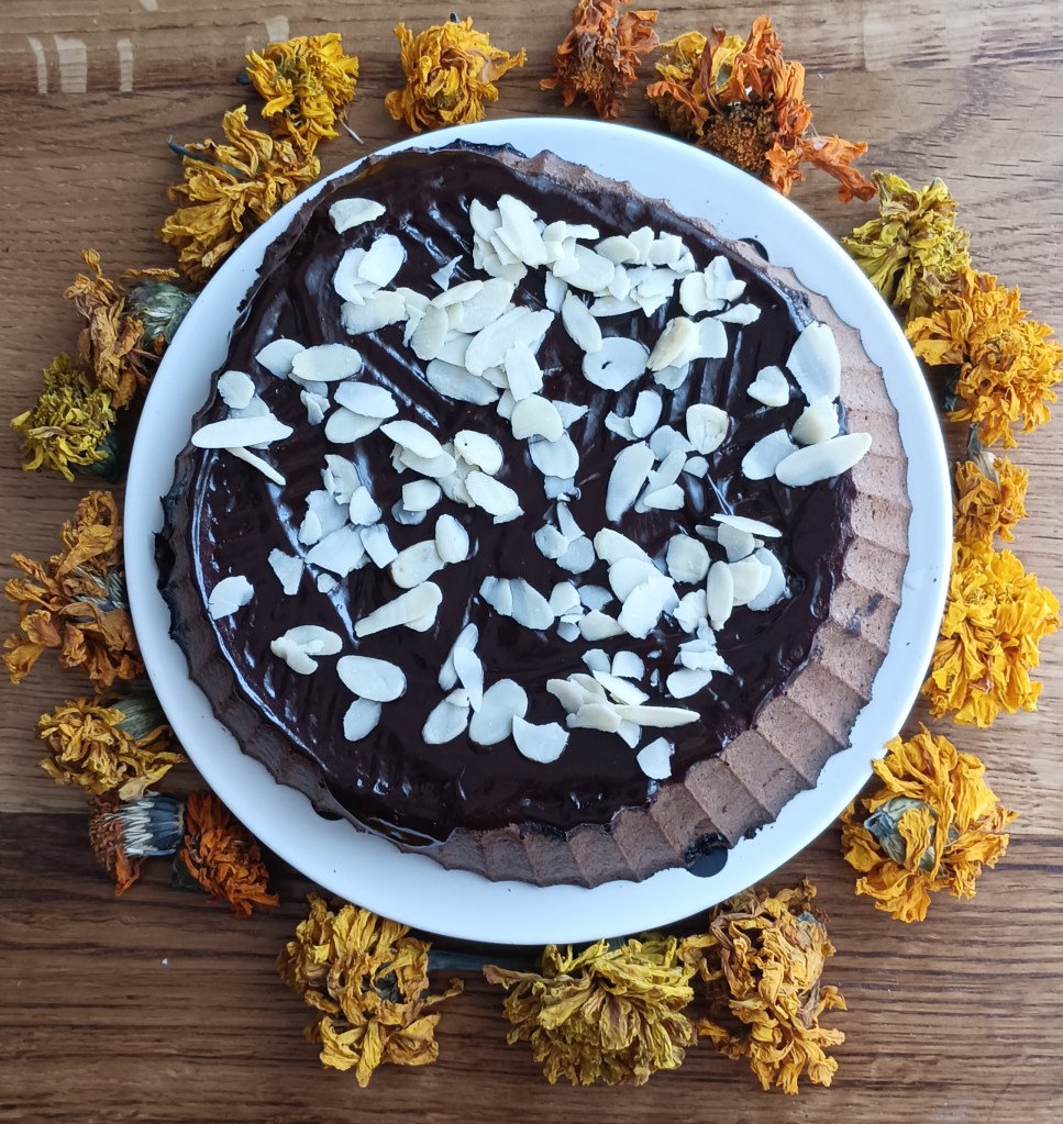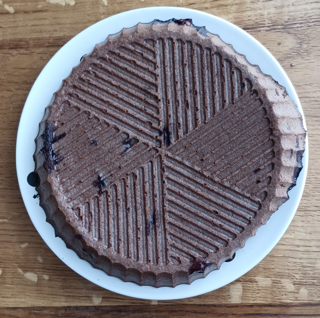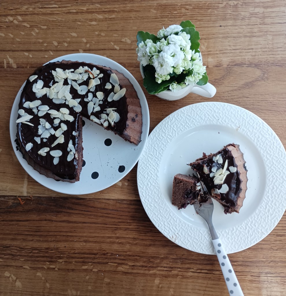 Smjese ima dosta pa se može dio istresti u kalupe za muffine, a dio u okrugli pekač od silikona (može i četvrtasti pleh). Peći na 190 do 200 stupnjeva 30 do 45 minuta ovisno o pećnici (probati s drvenim štapićem). Kolač iz kalupa može se preliti s otopljenom tamnom čokoladom i posuti listićima badema.