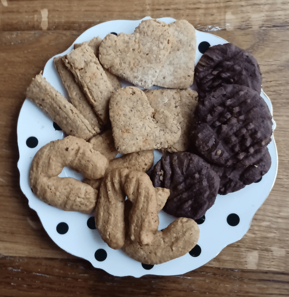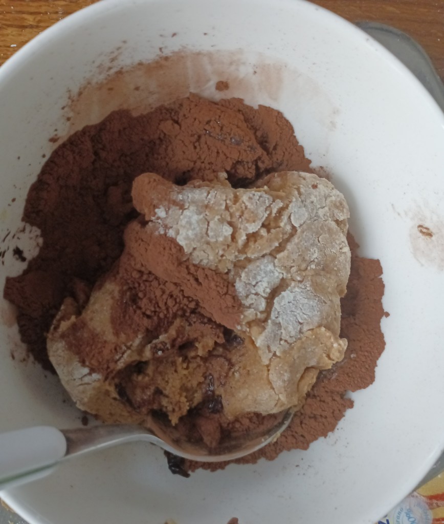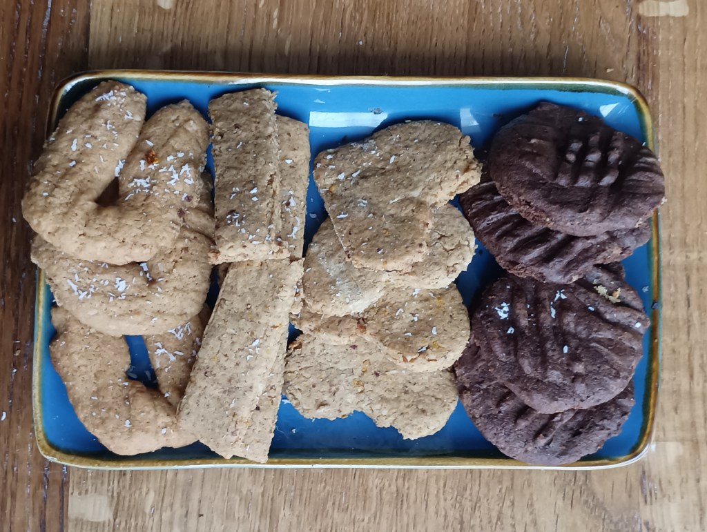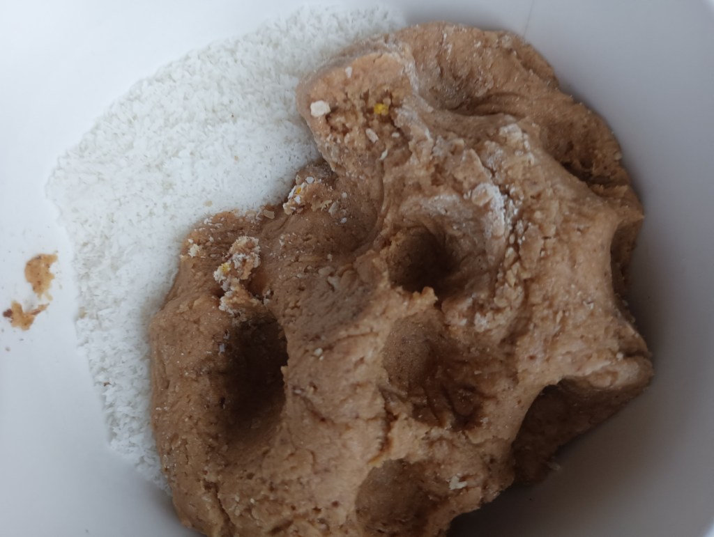 Zajednička smjesa tijesta za tri okusa: Vilicom izmiješati maslac sobne temperature sa kokosovim šećerom dok se ne sjedine, dodati jaja, miješati i polako dodavati brašno. Tijesto ne treba dugo mijesiti niti treba dodati sve brašno (brašna treba toliko da se tijesto ne lijepi). Tijesto treba da bude mekše. Kada se dobila smjesa tijesta podijeli se na tri dijela. U jednu posudu staviti samljevene lješnake, malo cimeta i korica naranče. U to umijesiti trećinu odvojenog tijesta dok se orasi ne stope u tijesto. U drugu posudu staviti kokos, dodati drugi dio tijesta te miješati dok se kokos ne stopi u tijesto. U treću posudu staviti dvije žlice kakaa i otopljenu čokoladu te staviti treći dio tijesta i mijesiti dok se ne stopi. Svako tijesto zamotati u prozirnu foliju i staviti u hladnjak što dulje (barem sat vremena).