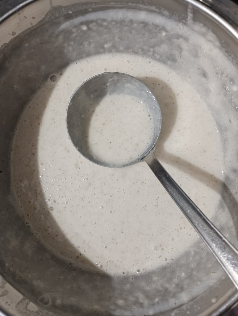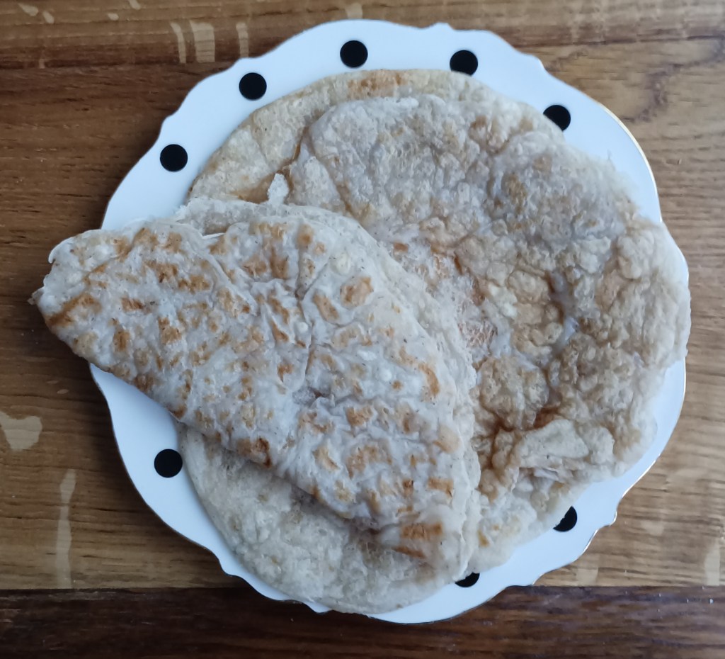 Izmiksati tijesto, Ljuskice namočiti s vodom (stoji jednu minutu) i istresti u smjesu, dodati ulje i sol. Ostaviti 15-tak minuta da odstoji. Ako se tijekom pečenja jako zgusne dodajte jednom ili višekratno mineralne vode, Grabljačom staviti na zagrijanu suhu tavu i razvući u krug po njoj i peći nekoliko minuta s jedne pa s druge strane. Može se nekoliko puta i okrenuti. Od ove smjese dobiju se četiri tortilje.