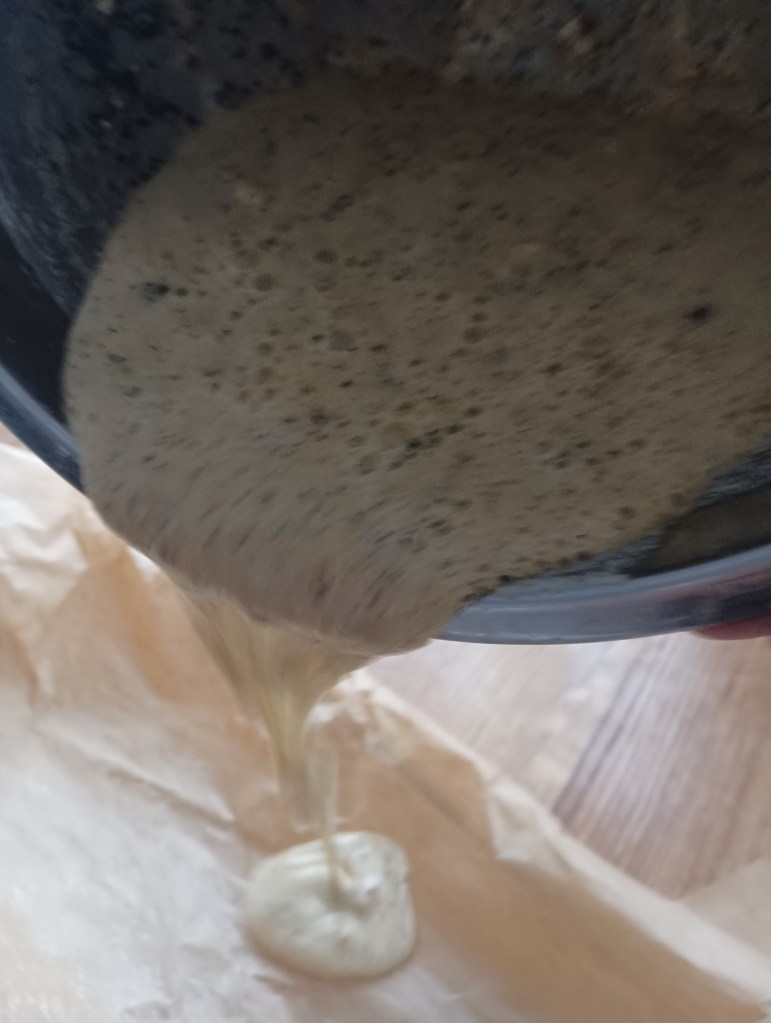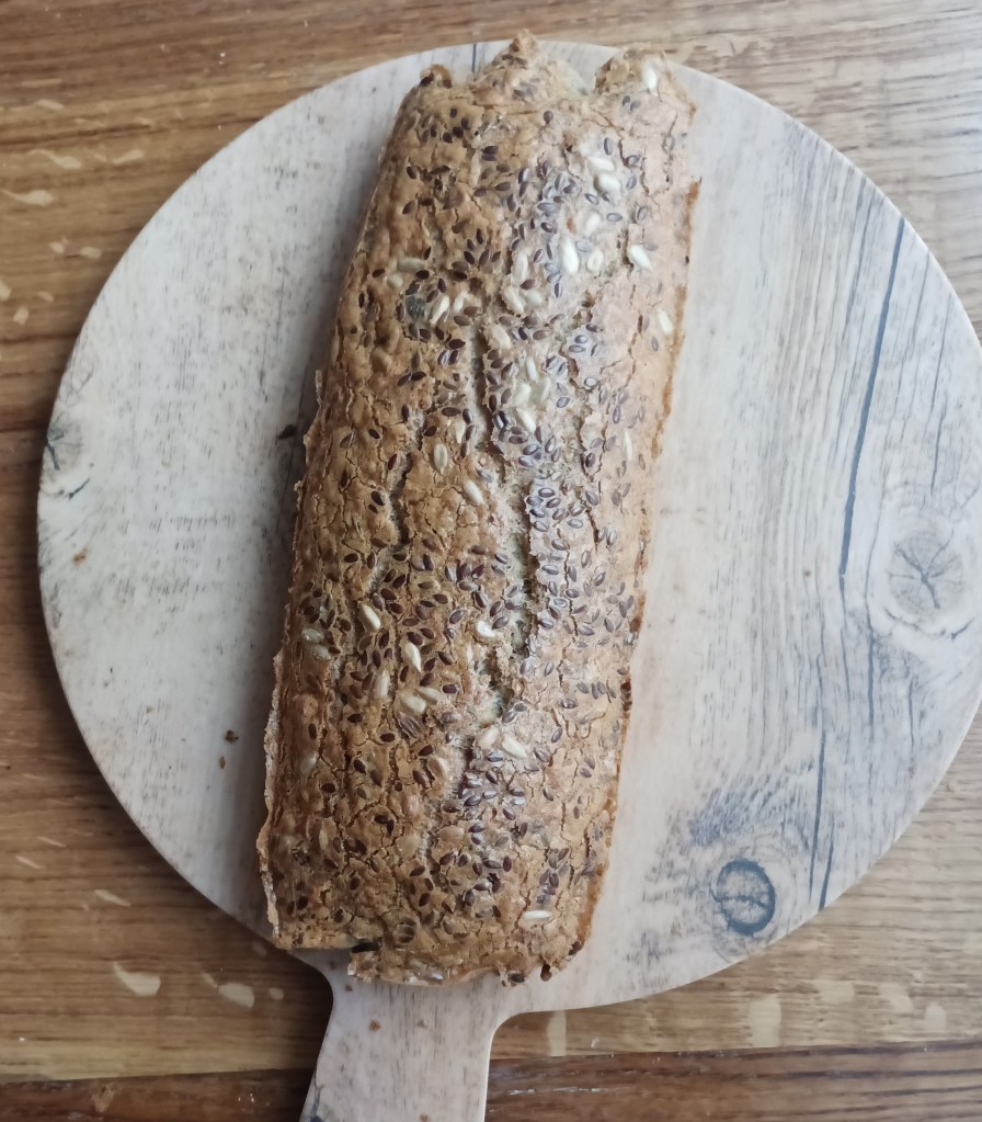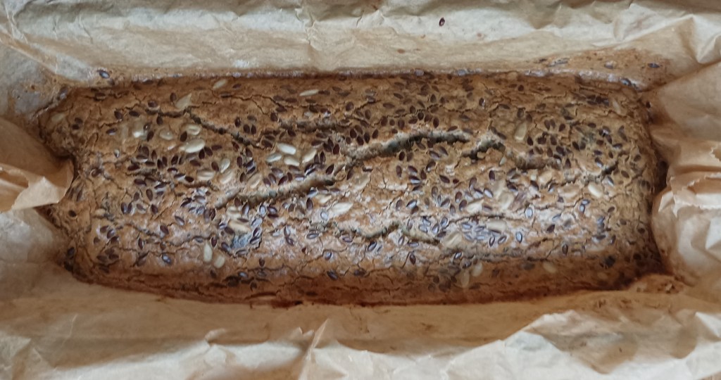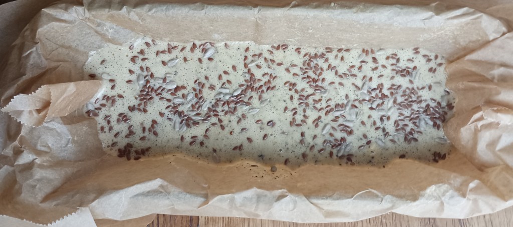 Umutiti jaja s uljem i soli, dodati brašno i namočenu žlicu psyllium ljuskica te bademovo mlijeko, Kada je umućeno ubaciti usitnjene orašaste plodove i sjemenke po želji. Istresti u kalup obložen papirom za pečenje (smjesa je dosta rijetka i takva treba biti). Posuti sjemenkama po izboru. Staviti u zagrijanu pećnicu na 200 stupnjeva i peći 40 do 50 minuta (ovisno o pećnici). Kada jer pečeno umotati u namočeni papir za pečenje i onda u kuhinjsku krpu, Rezati kad se ohladi.
