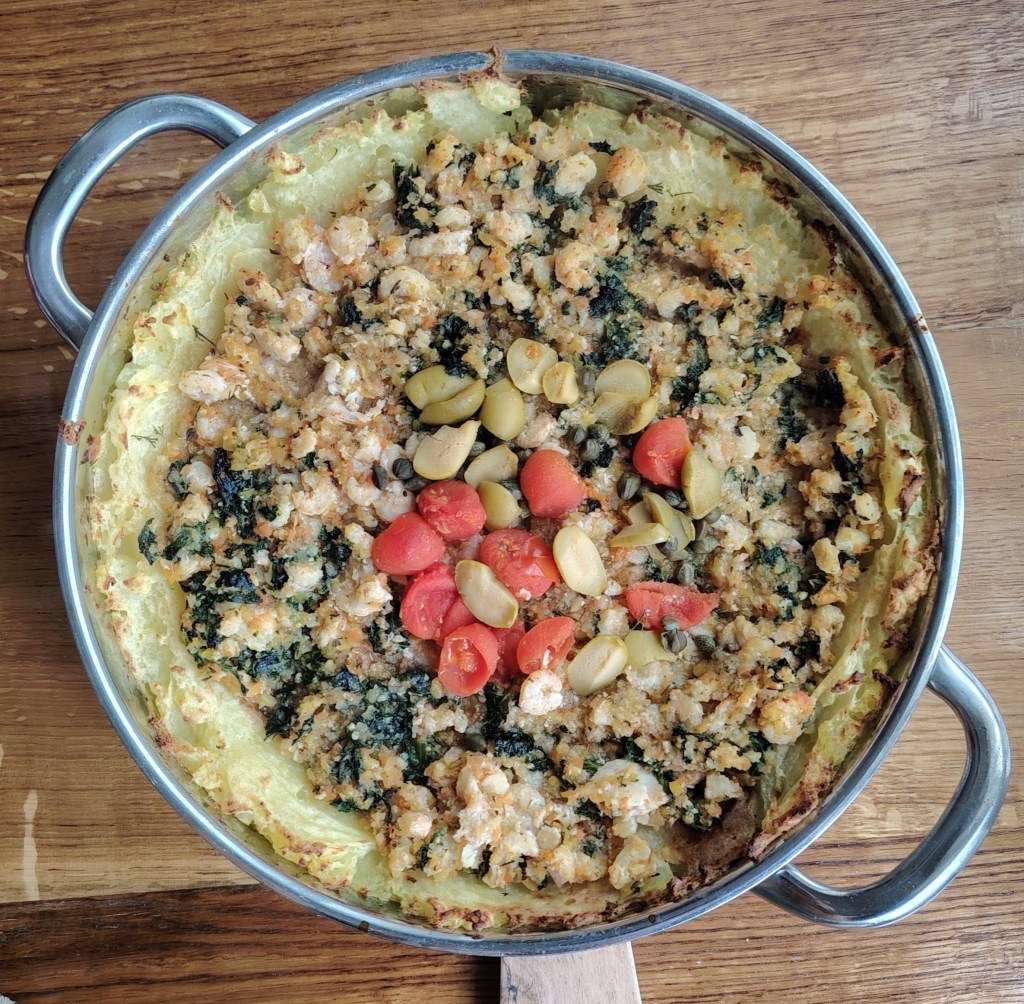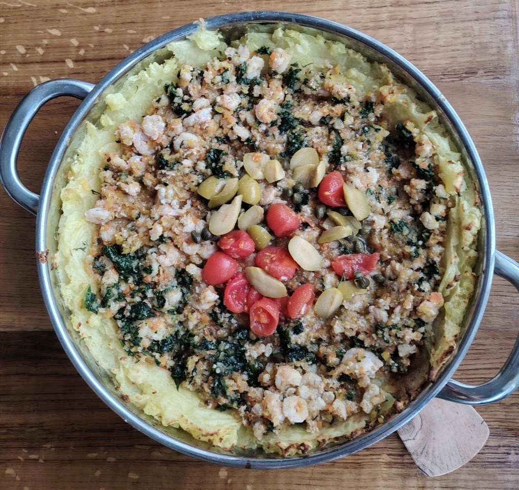 Kozice dinstati s povrćem (naribanim na rendu) uz dolijevanje vode ili temeljca, Posoliti i dodati mješavinu mediteranskih začina (obrada do 30 minuta). Preliti vrućom vodom male rajčice da se mogu oguliti. Skuhati krumpir (u slanoj vodi) i izgnječiti (ne do kraja, neka ostane i malo komadića). U pleh (tavu) za pečenje nauljenu maslinovim uljem utisnuti kuhani krumpir s udubljenjem. Posuti malo sa svježim koprom ili peršunovim listom, pouljiti maslinovim uljem i staviti u pećnicu da se malo zapeče i uhvati korica. Izvaditi i poslagati dinstane kozice s povrćem, u sredinu staviti paradajziće, kapare i masline i ponovo staviti u pećnicu na 15-ak minuta. Poslužiti toplo sa sirom ribancem.
