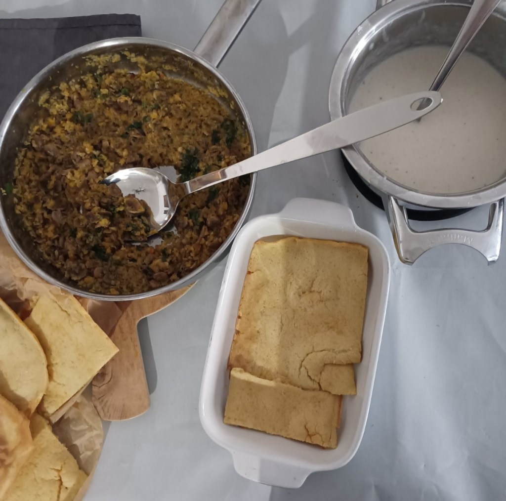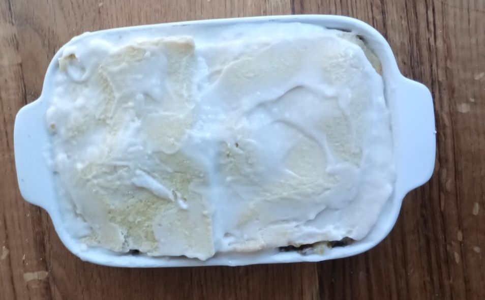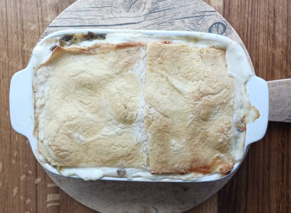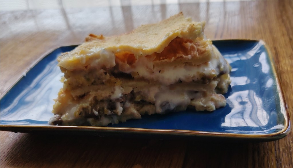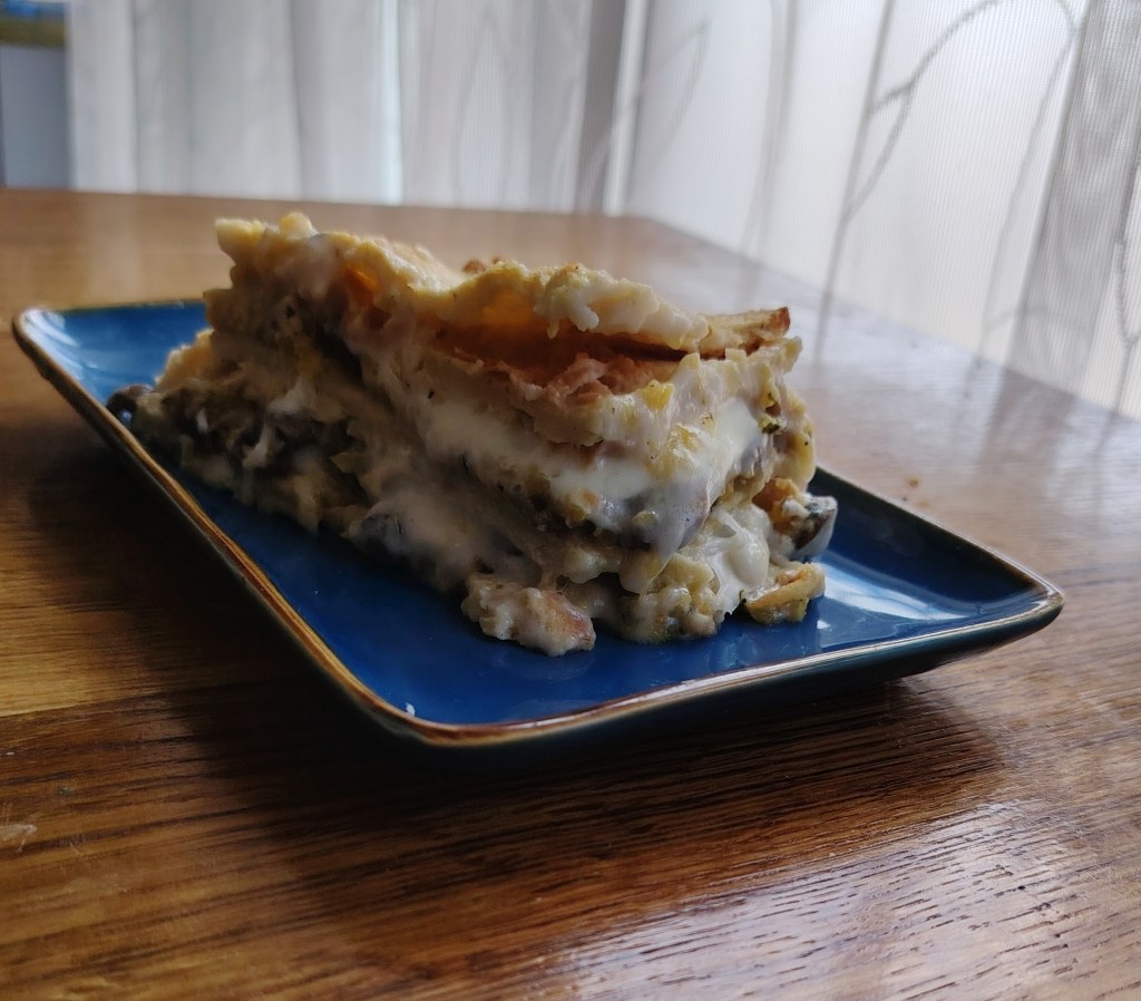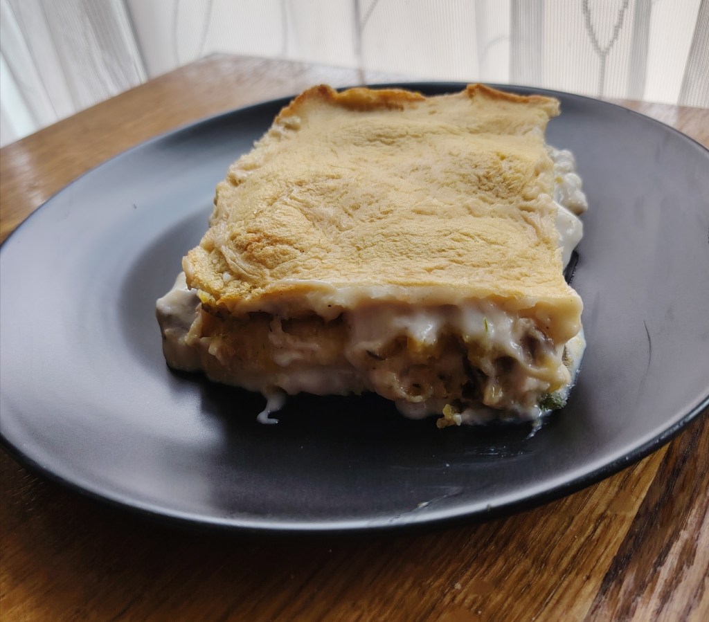 Bešamel: Miješati na ulju rižino brašno (i tapioku), kada dobije boju zaliti mlijekom i dobro miješati nekoliko minuta (dok ne provrije) da ne bude grudica. Dodati sol i muškatni oraščić. Bešamel treba biti ni gust ni rijedak, no bolje rjeđi jer će tako natopiti kore.