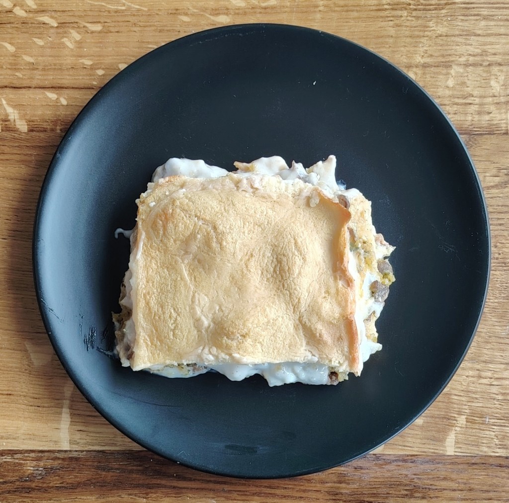 Postupak za tijesto – palačinke: Sve sastojke izmješati u multipraktiku. Smjesa je ni jako rijetka ni gusta, ista je kao kad se peku palačinke u tavi. Istresti u veliki pleh (od pečnice) obložen papirom za pečenje. Mora biti veliki pleh kako bi se dobilo tanko tijesto. Peći na 200 stupnjeva 20-tak minuta. Kada se ohladi rezati trake (komade) veličine posude u kojoj će se lazanje peći. Puniti nadjevom i bešamelom.