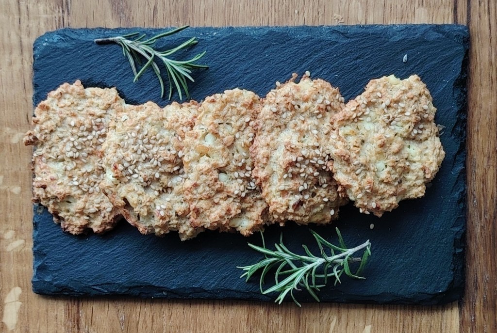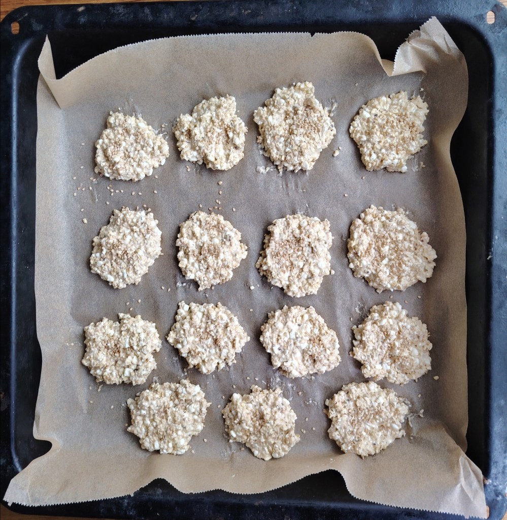 Izmutiti jaja, ulje, dodati sir i zobene pahuljice te začine. Smjesa je ni gusta ni rijetka, vadi se žlicom i stavlja na papir za pečenje na plehu od pećnice. Sa žlicom se malo oblikuje pogačica. Pospe se sezamom. Peče se u zagrijanoj pećnici na 190 stupnjeva 30-ak minuta.