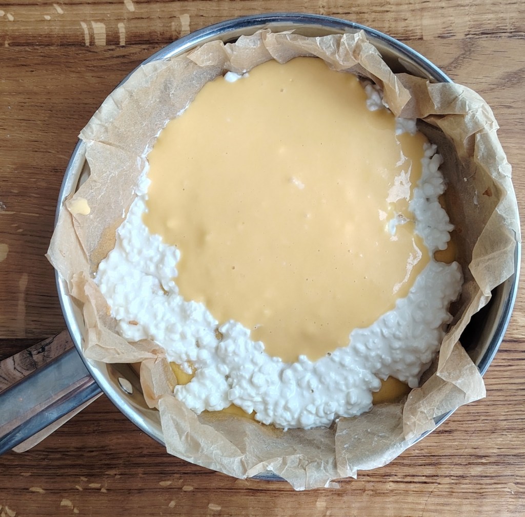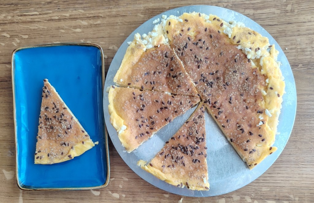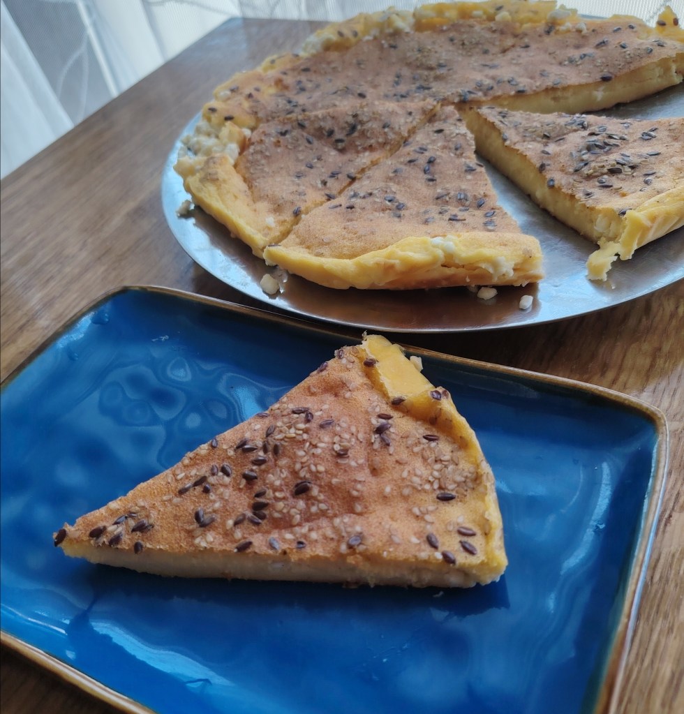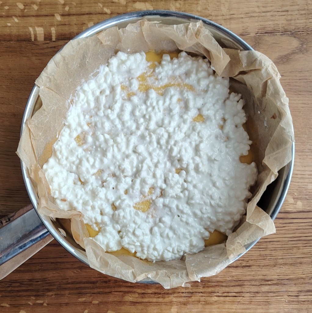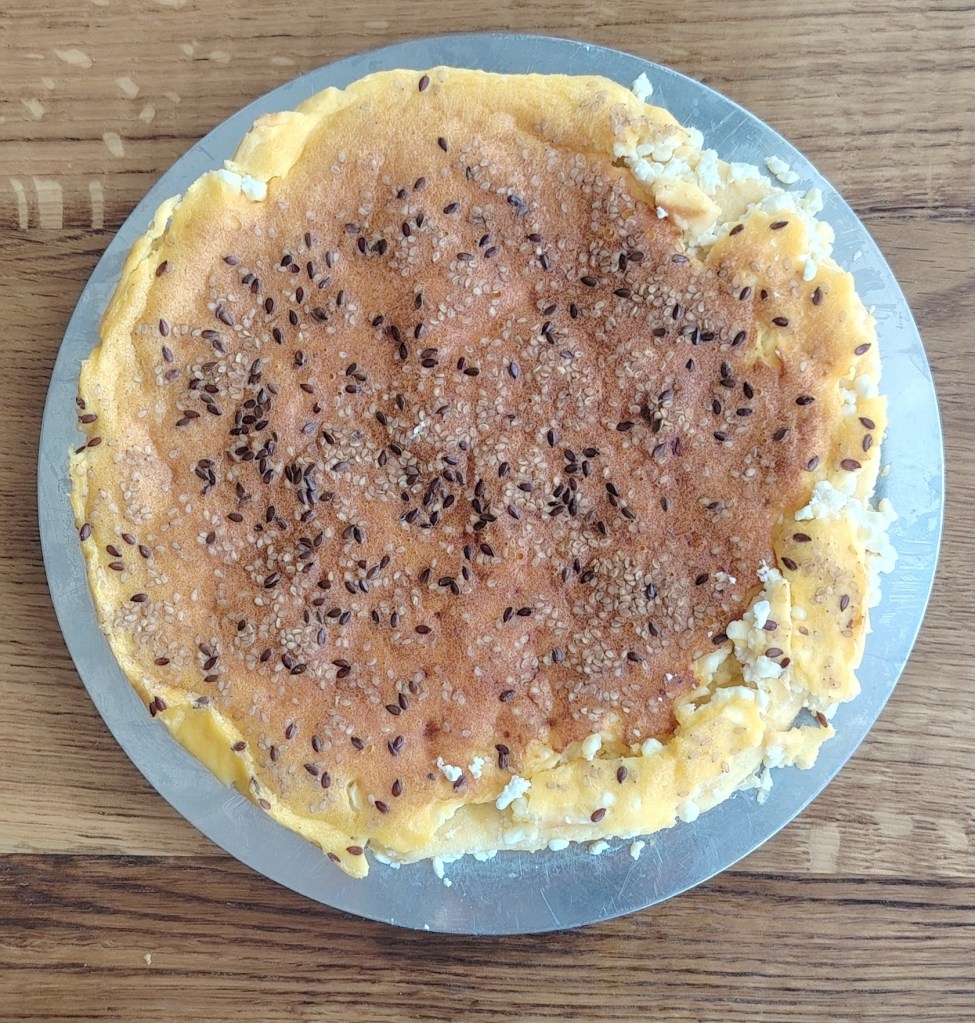 Uzeti manji okrugli kalup (može i četvrtasti), obložiti papirom za pečenje i u njega izliti pola zamućene smjese. Ovdje je dosta velika tava pa je pita tanja. Staviti u zagrijanu pećnicu od 200 stupnjeva i peći desetak minuta. Izvaditi i na podlogu rasporediti ocijeđeni zrnati sir te preko toga preliti drugu polovicu tijesta. Posuti sa sjemenkama sezama i lana. Peći još trudesetak minuta na istoj temperaturi. Ohlađeno rezati.