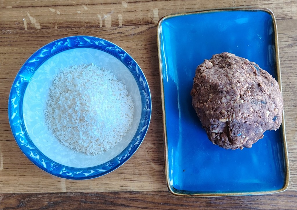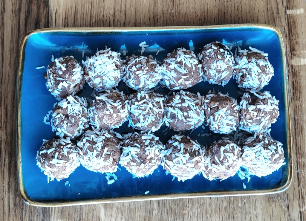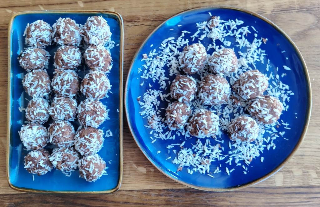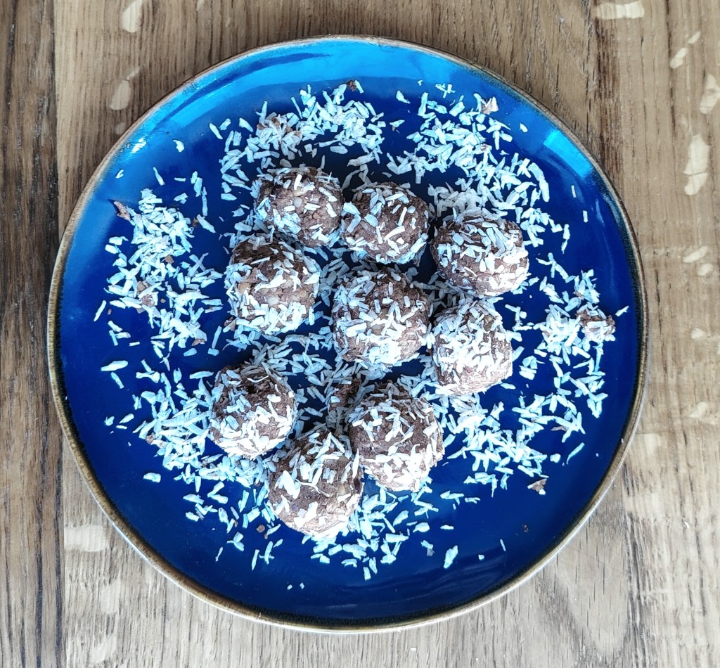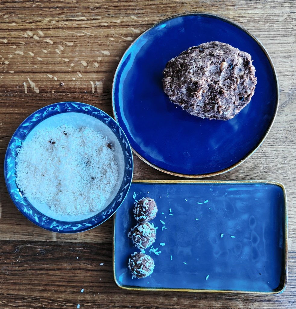 Sve sastojke staviti u blender. Dobro izmiksati i u smjesu, znog glatkoće, dodati nekoliko žlica hladne vode. Izvaditi iz blendera zamijesiti i oblikovati kuglice te uvaljati u kokos. Mogu se odmah jesti. Držati ih na hladnom mjestu, a mogu se i zamrznuti. S ovom količinom smjese dobije se preko 20 kuglica.