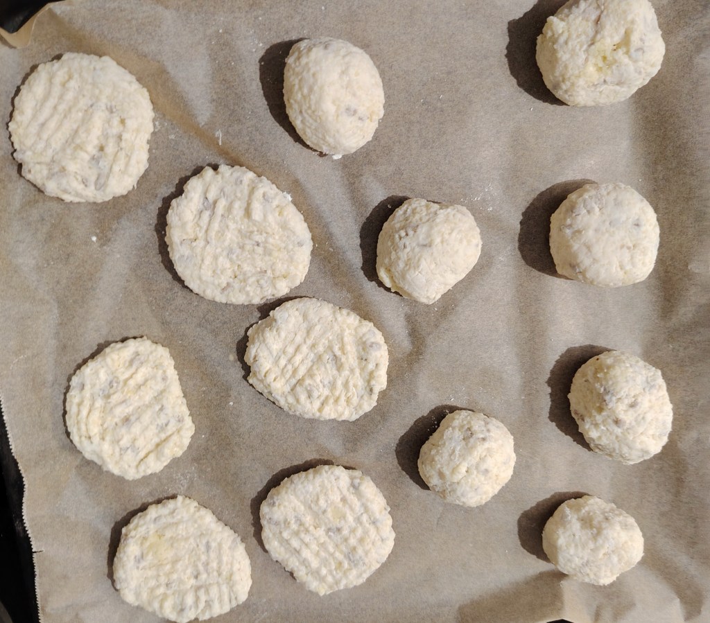 Skuhanom prosu dodati sve sastojke i zamijesiti tijesto koje se ne lijepi. Zarolati ga u valjak i rezati kolutove od kojih se naprave kugle. Kugle se s vilicom pritisnu da se dobije okrugla pogačica (vidjeti slike). Premaže se s uljem i pospe sa sezamom.