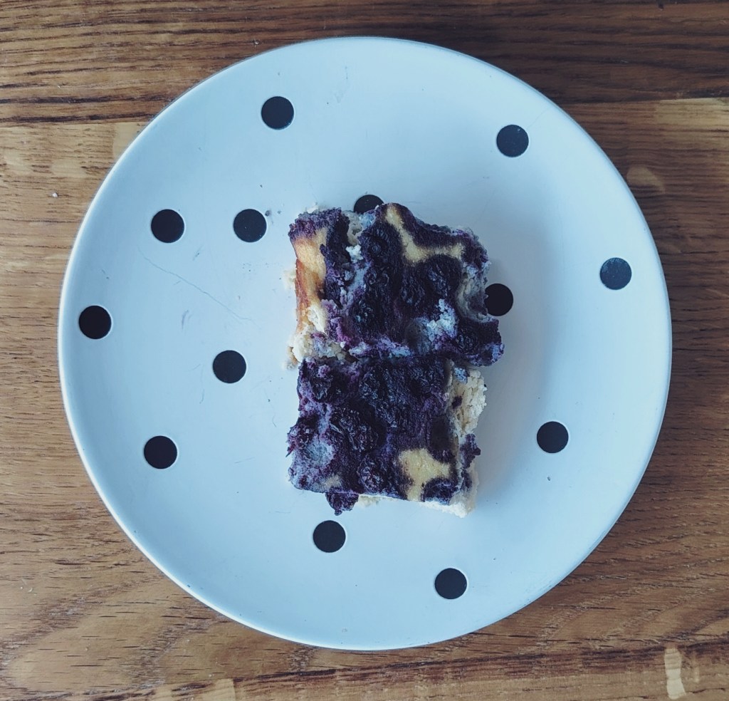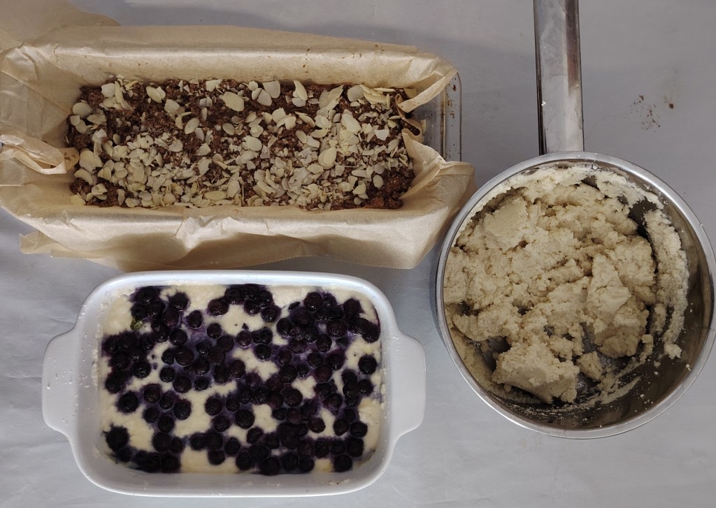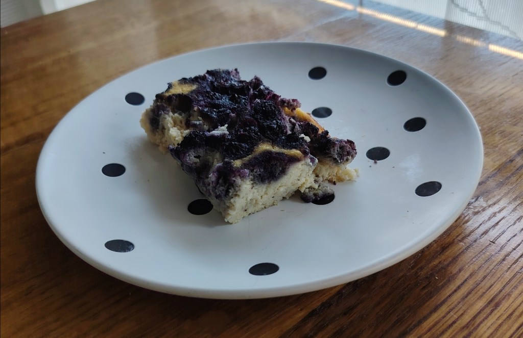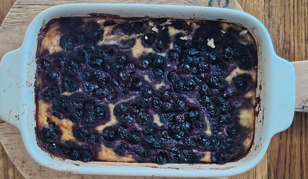 Trećini smjese dodati još jedno jaje i malo praška za pecivo (može, a ne mora). Smjesu istresti u manji kalup i po njemu rasporediti borovnice (ovdje su smrznute). Peći u pećnici na 190 stupnjeva oko sat vremena. Tijesto je sočno s voćem, a jede se kada se ohladi. Može se vaditi i rezati na šnite, a može se vaditi žlicom. Za obogaćivanje može se dodati kuglicu domaćeg sladoleda.
