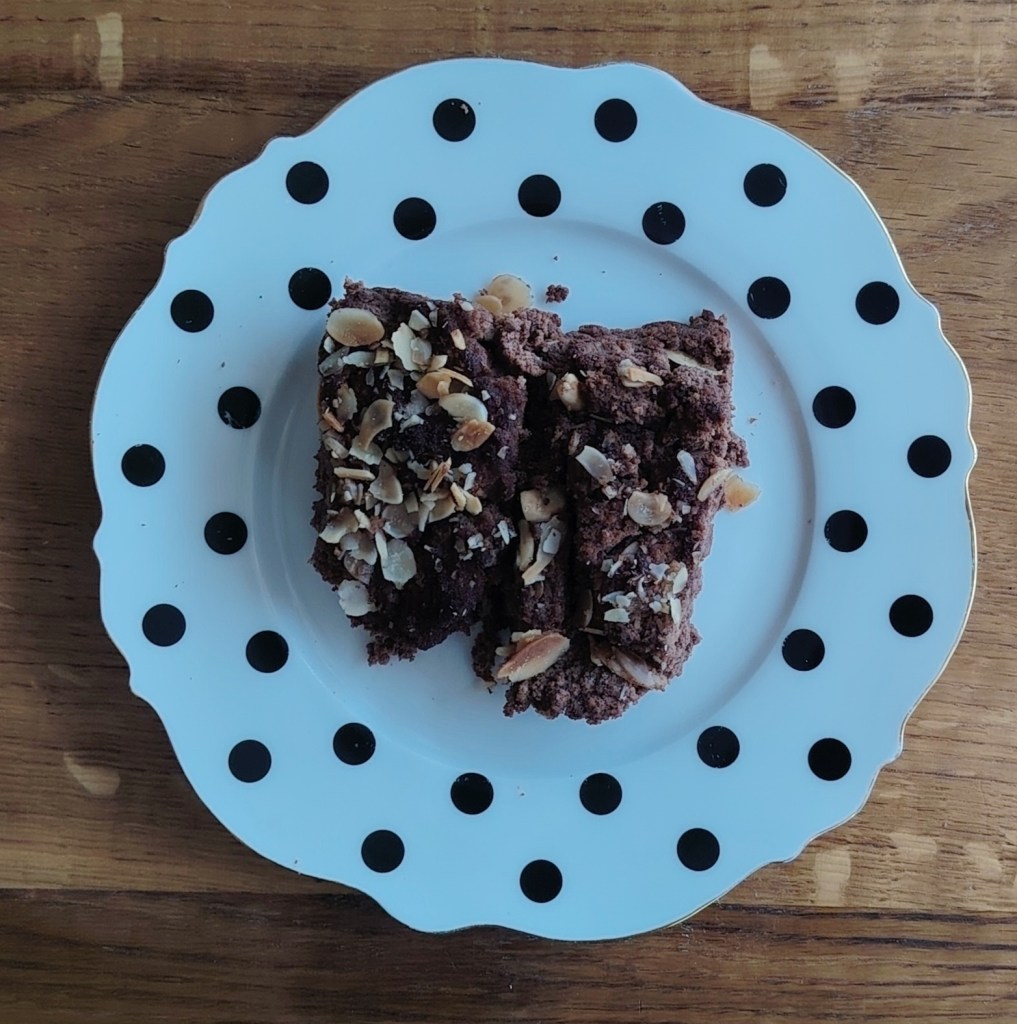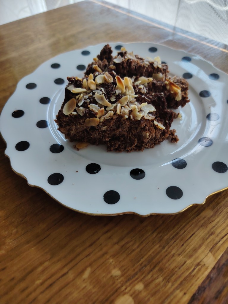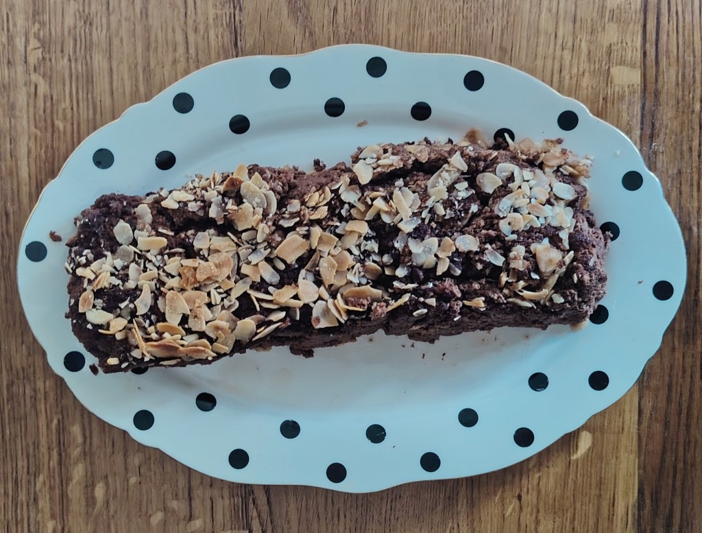 Trećini smjese dodati još jedno jaje, žličicu cimeta i 2 žlice kakaa te sladilo (količina i vrsta po želji). Malo praška za pecivo može, a ne mora, Smjesa se istrese u manji klaup (ovdje je duguljast), pospe s listićima badema i peče se u pećnici na 190 stupnjeva oko sat vremena. Služi se ohlađeno izrezano na kocke ili izvađeno sa žlicom. Može se dodati još voća i/ili domaći sladoled.