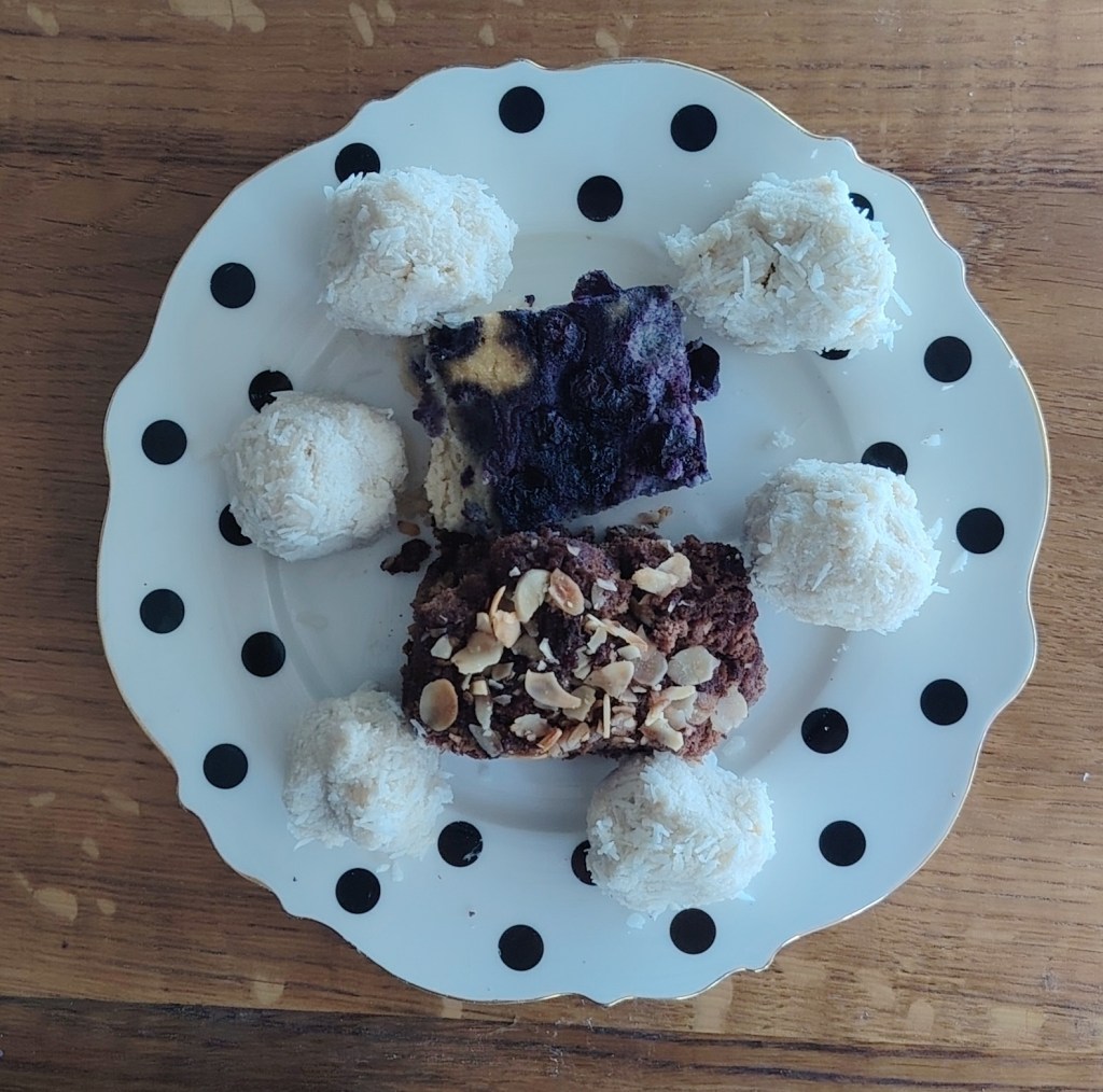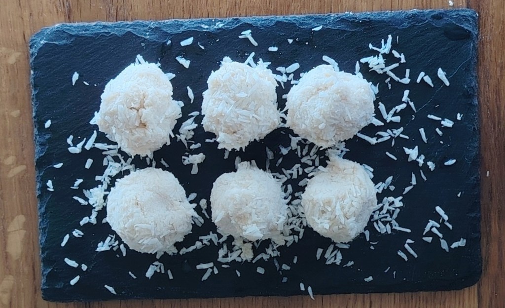 Od ukupne smjese izvaditi s cjedilom trećinu, najgušći dio (tekućina se ocijedi). Dodati 4 do 5 žlica kokosovog ulja i sladilo po želji (vrsta i količina) te kuhati smjesu uz miješanje 10-ak minuta. Kada se ohladi staviti u zamrzivač do 1 sat. Izvaditi i mokrim rukama oblikovati kuglice u koje se stavi tostirani badem ili lješnjak te umočiti u kokos ljuskice. Držati u hladnjaku. Može se zamrznuti.