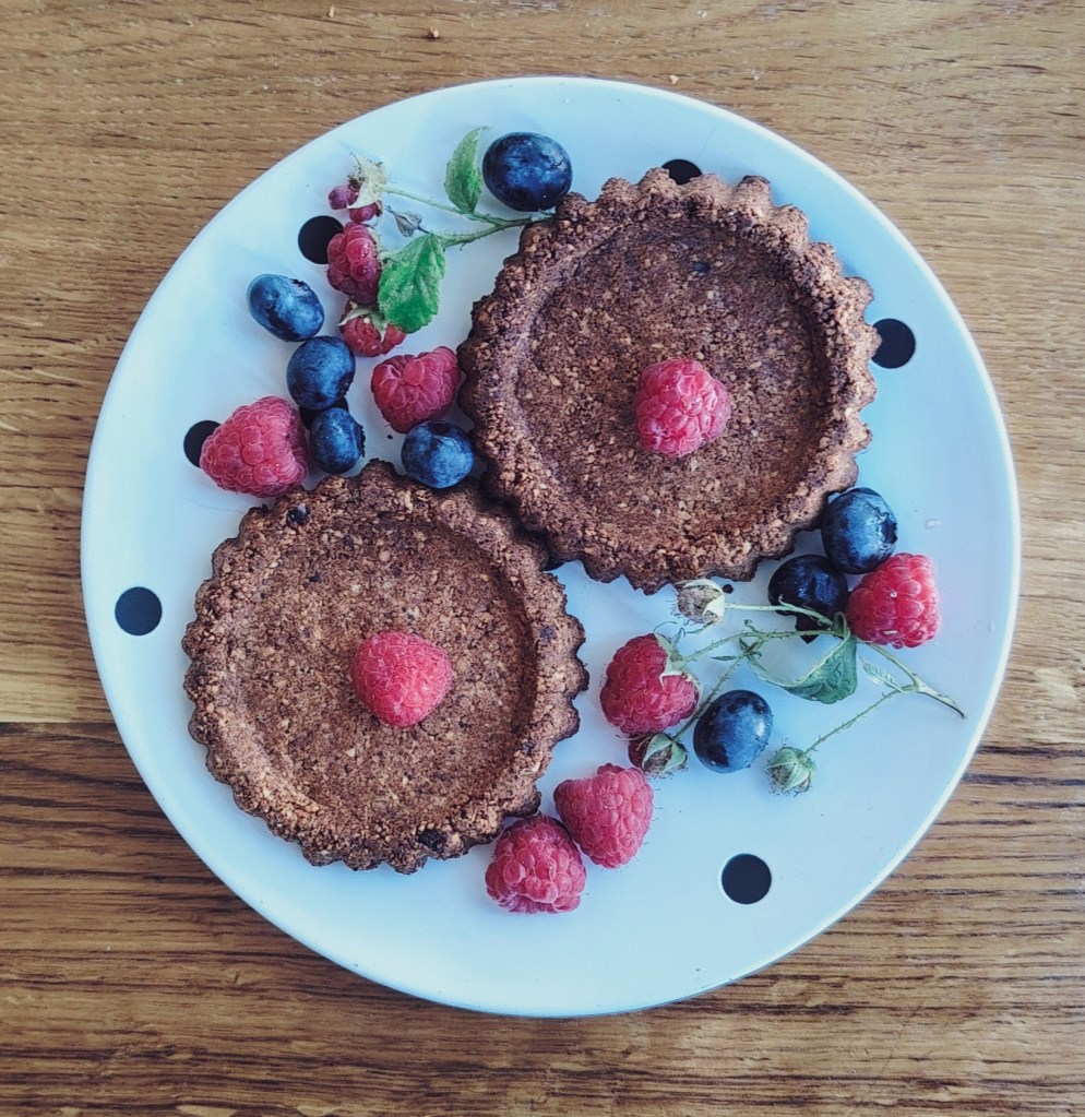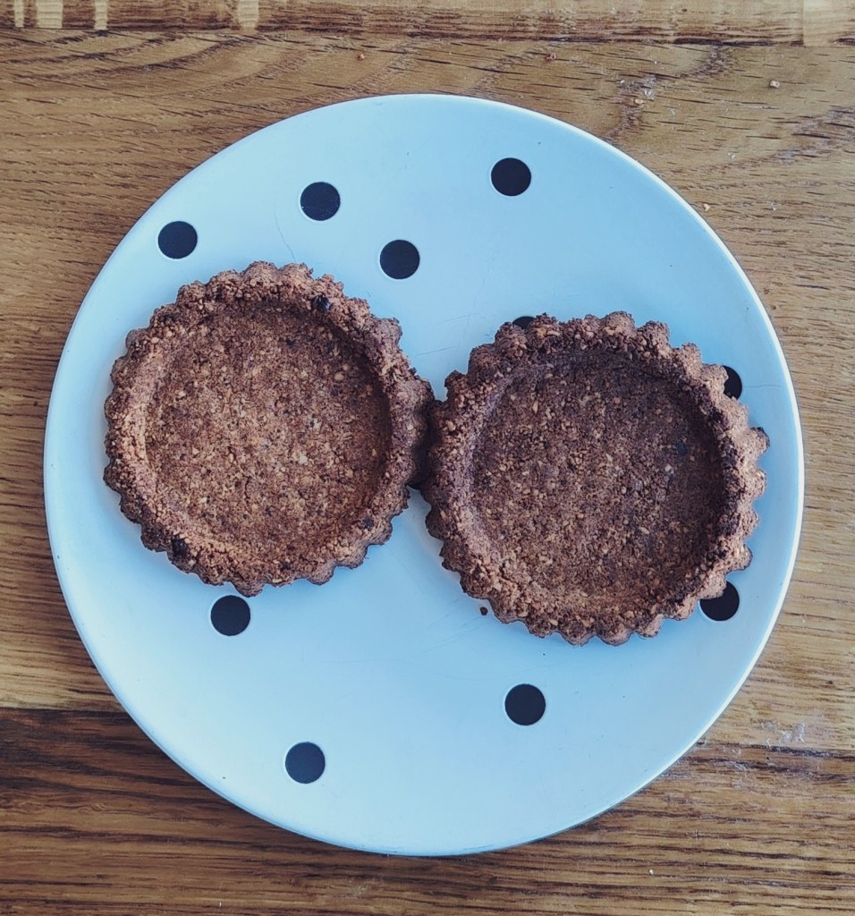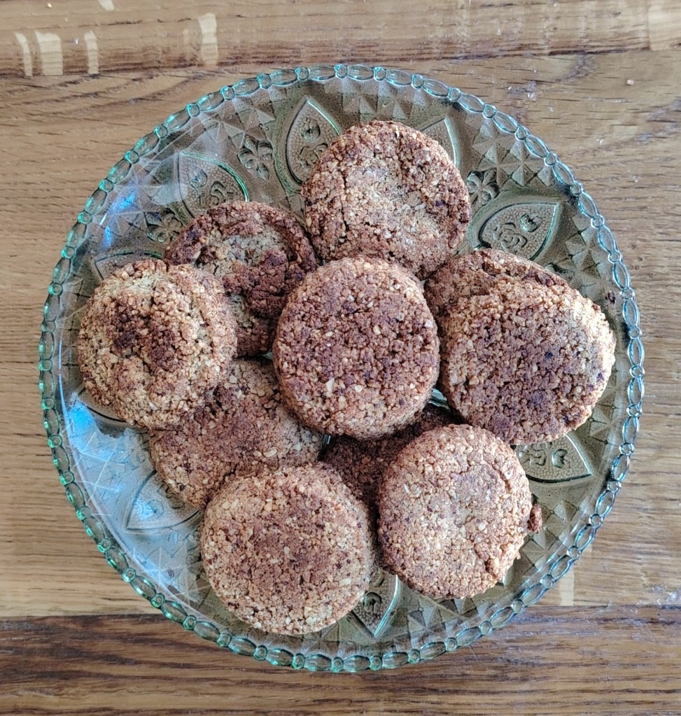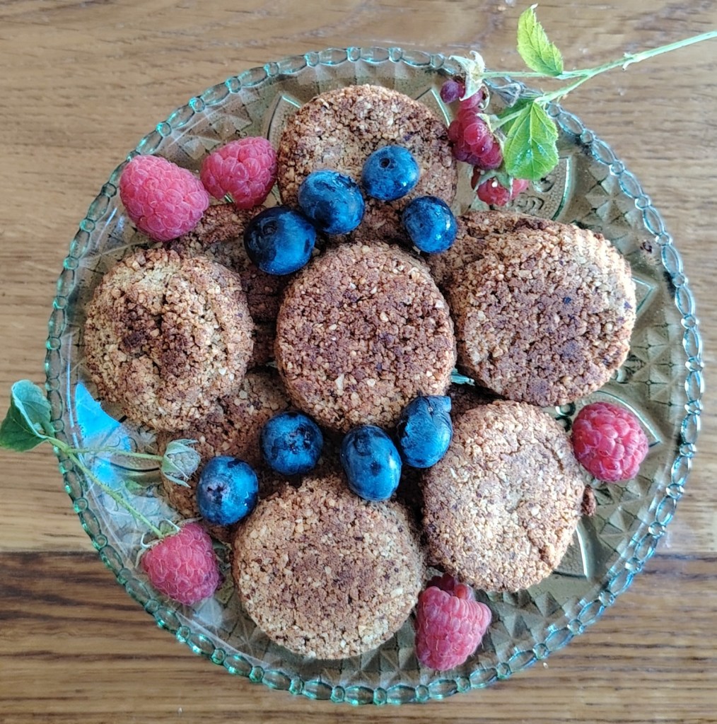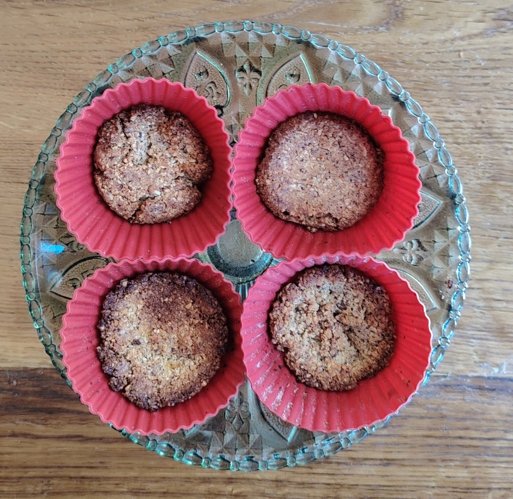 U mljevene bademe ili lješnjake, ili mješavinu, dodati bademov maslac i malo narančinog soka (ili vode) kako bi se sastojci spojili. Sa žlicom vaditi smjesu iste količine te utisnuti u silikonski kalup za muffine (može i silikonski kalup raznih oblika). Debljina keksića bi trebala biti oko 1 cm. Staviti peći na 190 stupnjeva 15-ak minuta ili dok ne porumene (paziti da ne pregore). Vaditi i ostaviti da se ohladi. Može ih se premazati čokoladom ili pekmezom i posuti listićima badema i voćem, ali i bez ičega su ukusni.