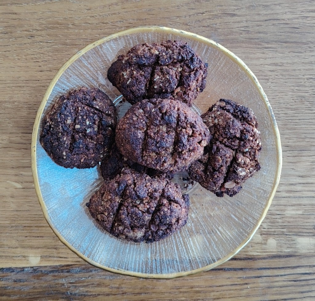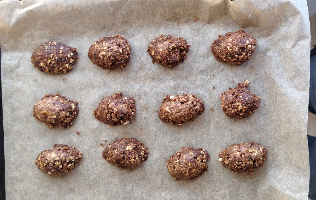 Sastojke izmiješati i dodavati žlicu po žlicu hladne vode da se može zamijesiti tijesto. Smjesu vaditi žlicom umočenom u vodi ili mokrim rukama te oblikovati keksiće po želji. Slagati na pleh prekriven papirom za pečenje. Peći na 190 stupnjeva 15 do 20 minuta (5 minuta uključiti ventilator).