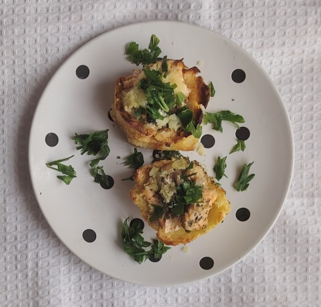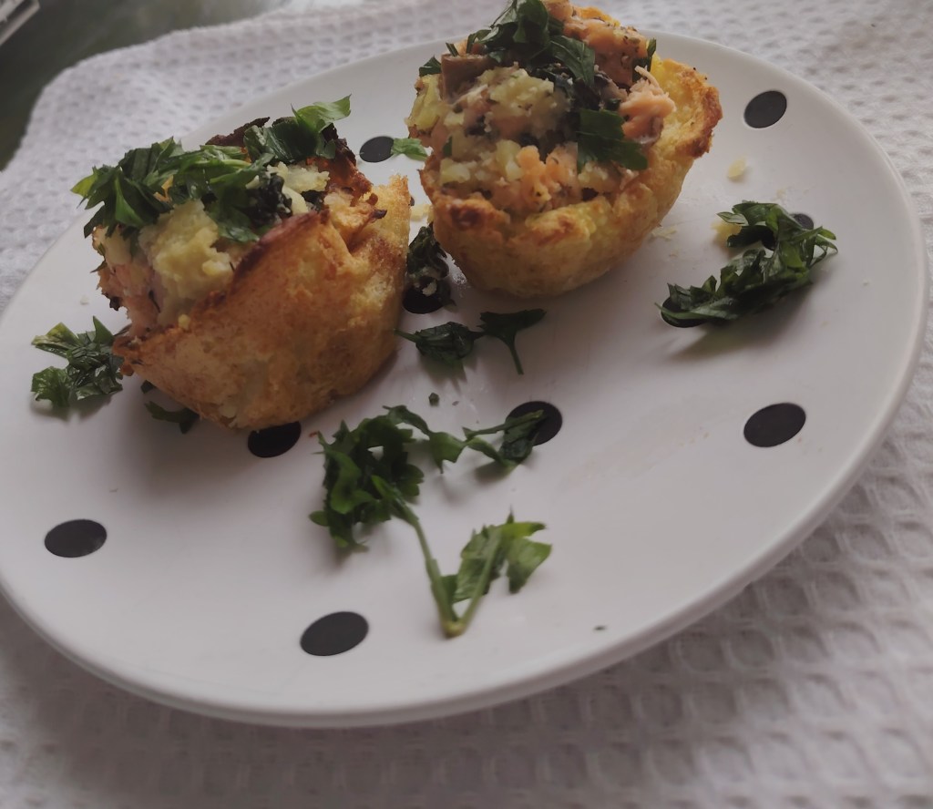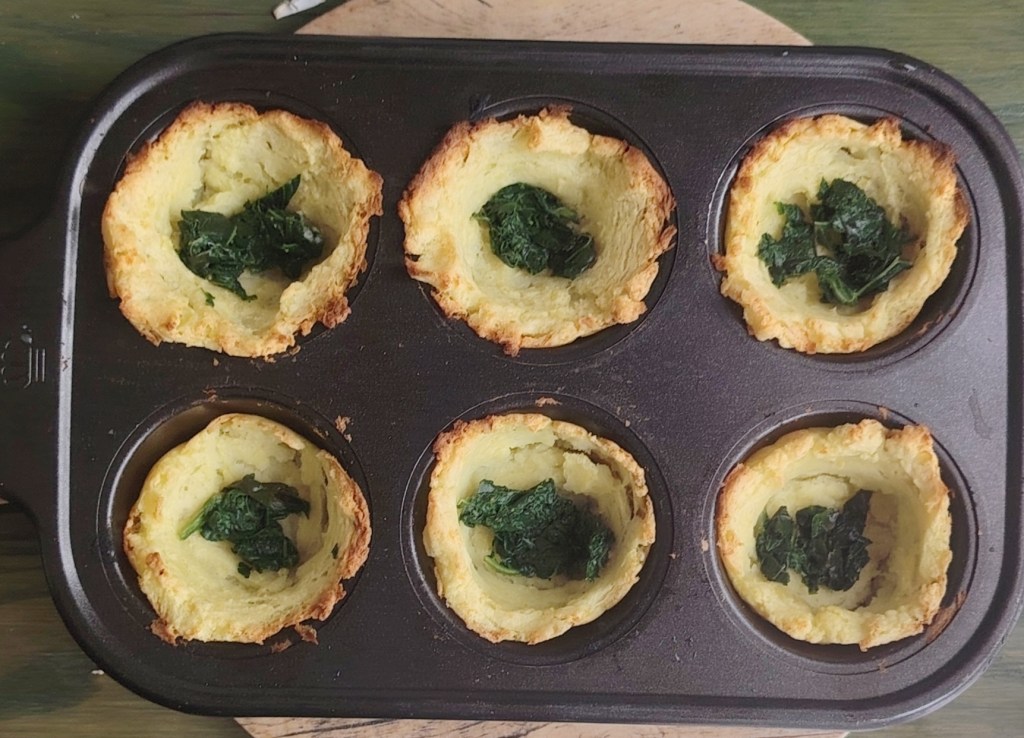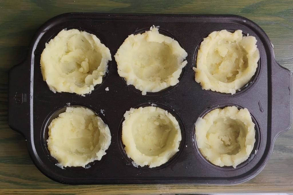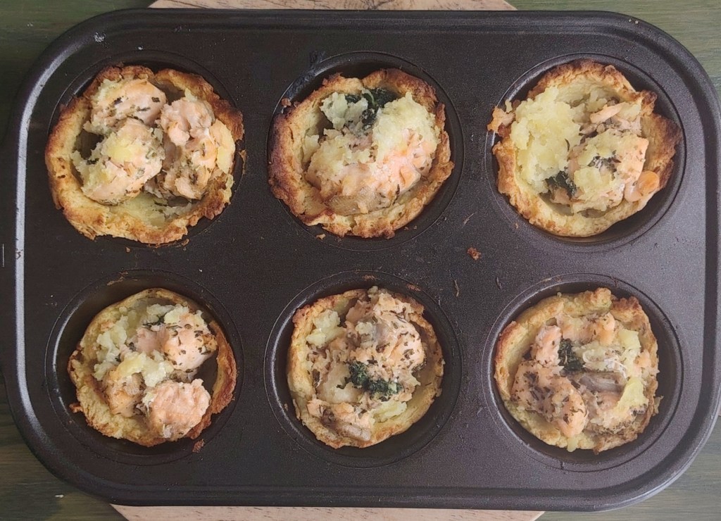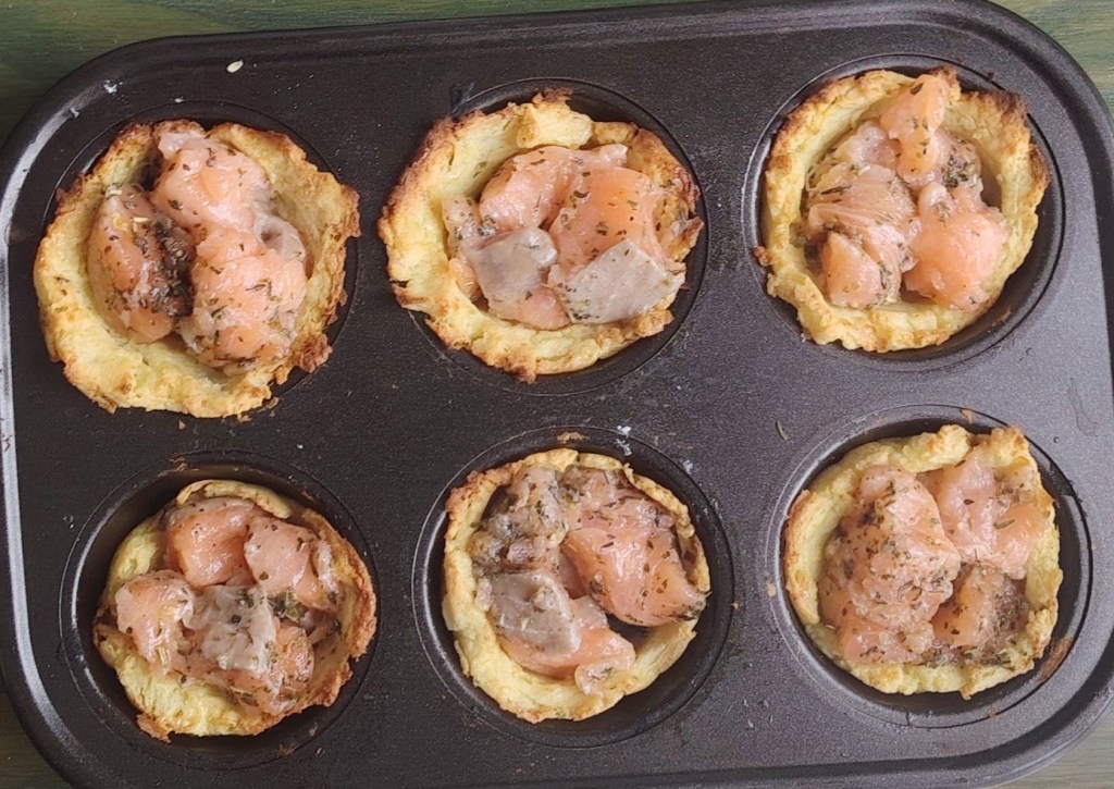 Skuhani i posoljeni pire krumpira staviti u namašćene otvore kalupa za muffine, stisnuti s prstima ili malom čašicom kako bi se napravila rupa i krompir se rasporedio oko ruba. Peče se u pećnici na 180 stupnjeva 15-ak minuta. Za to vrijeme se marinira losos narezan na kockice (maslinovo ulje, mješavina mediteranskih začina, malo soli i malo limuna). Kada se izvadi kalup u otvore se stavi blitva pa marinirani losos i vrati u pećnicu još dvadesetak minuta. Poslužuje se toplo kao predjelo ili lagana večera.